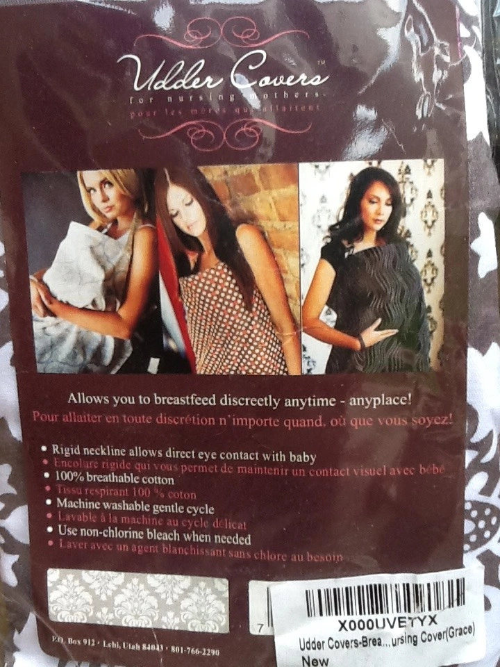 Item was only removed to take the pics. These go for 35.00 on the company website. We also have one of these same covers brand new, without the original packaging for 5.00. Allows you to breastfeed discretely anytime, anyplace. Rigid neckline allows direct eye contact with baby. 100% breathable cotton. Machine washable gentle cycle. Use non-chlorine bleach as needed. From a smoke and pet free home. Check out in person before purchasing. Thanks for looking.