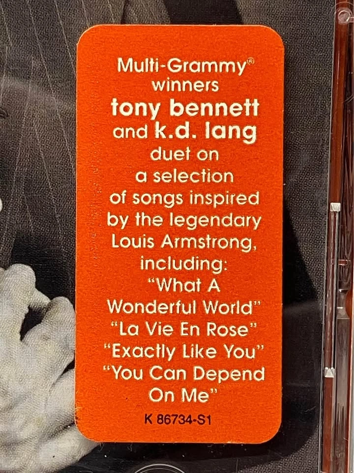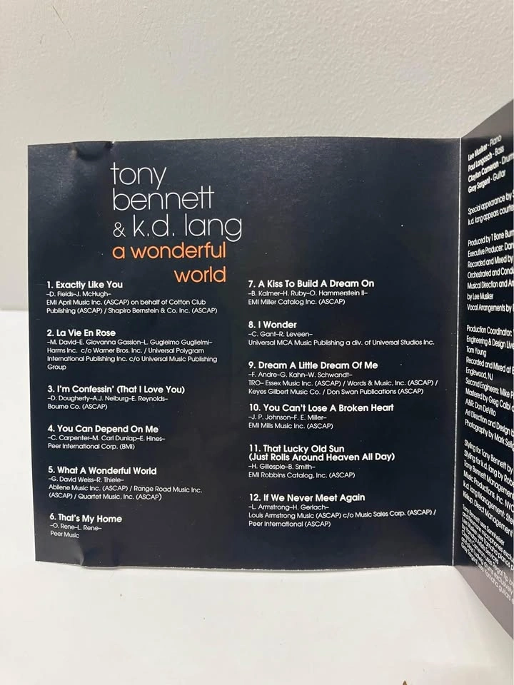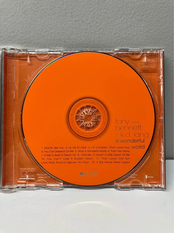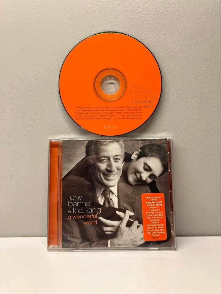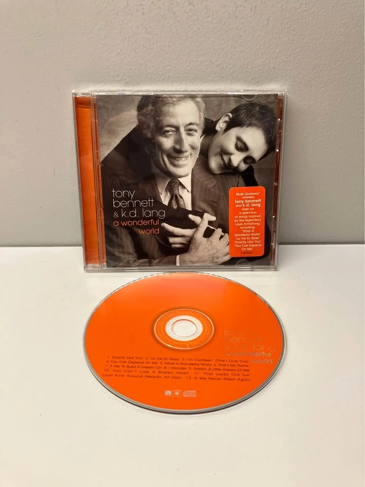 Tony Bennett And K.D. Lang - A Wonderful World Cd - Excellent Condition Case and disc are in excellent condition and CD plays perfectly. Description from Amazon: Big band crooner Tony Bennett and adult contemporary star k.d. lang initially seemed like an odd pairing for touring partners in the 1990s, especially given their age difference and separate audiences, but a hit duet and tour later nobody could doubt that they make beautiful music together. Track listing is as follows: 1 Exactly Like You 2 La Vie En Rose 3 I'm Confessin' (That I Love You) 4 You Can Depend On Me 5 What a Wonderful World 6 That's My Home 7 A Kiss to Build a Dream On 8 I Wonder 9 Dream a Little Dream of Me 10 You Can't Lose A Broken Heart 11 That Lucky Old Sun (Just Rolls Around Heaven All Day) 12 If We Never Meet Again From a smoke and pet free home. Check out in person before purchasing. Thanks for looking.