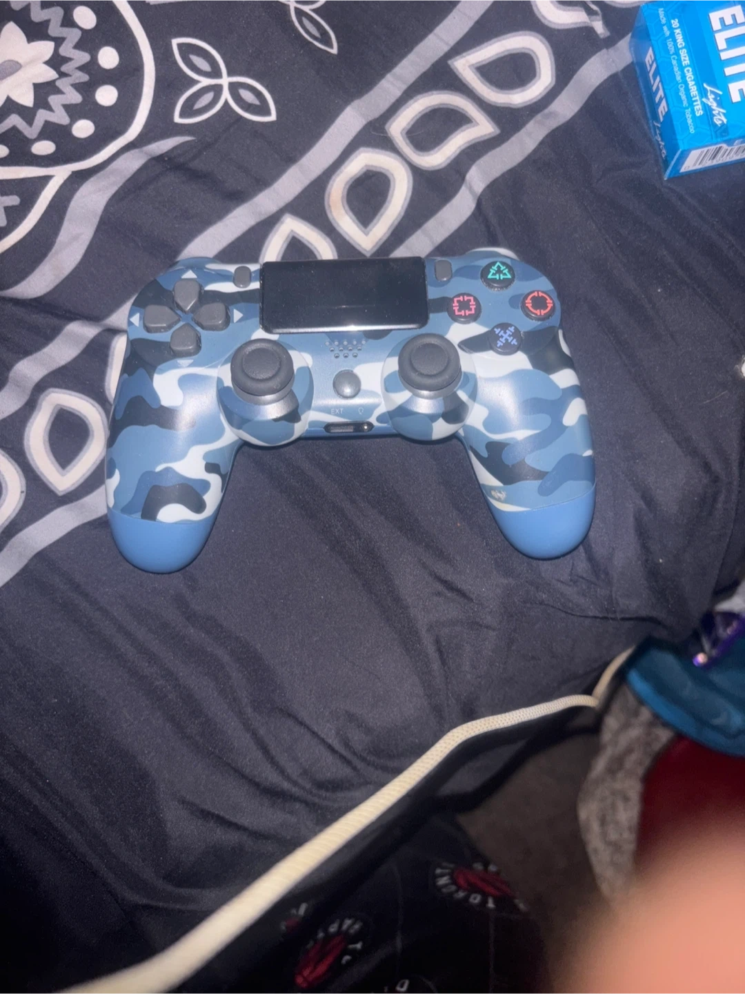 Selling a PlayStation 4 controller with a cool blue camouflage design! It's in good condition and ready for some gaming action