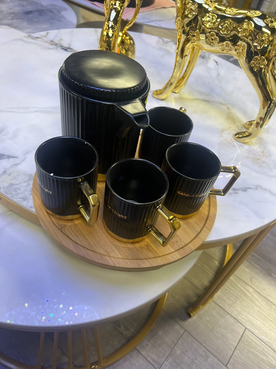 Here's a stylish black tea set called Golden Light! It comes with a teapot, four matching cups, and a wooden tray. The cups and teapot have a unique ridged design and gold accents on the handles. This set would be perfect for afternoon tea or adding a touch of elegance to your kitchen
