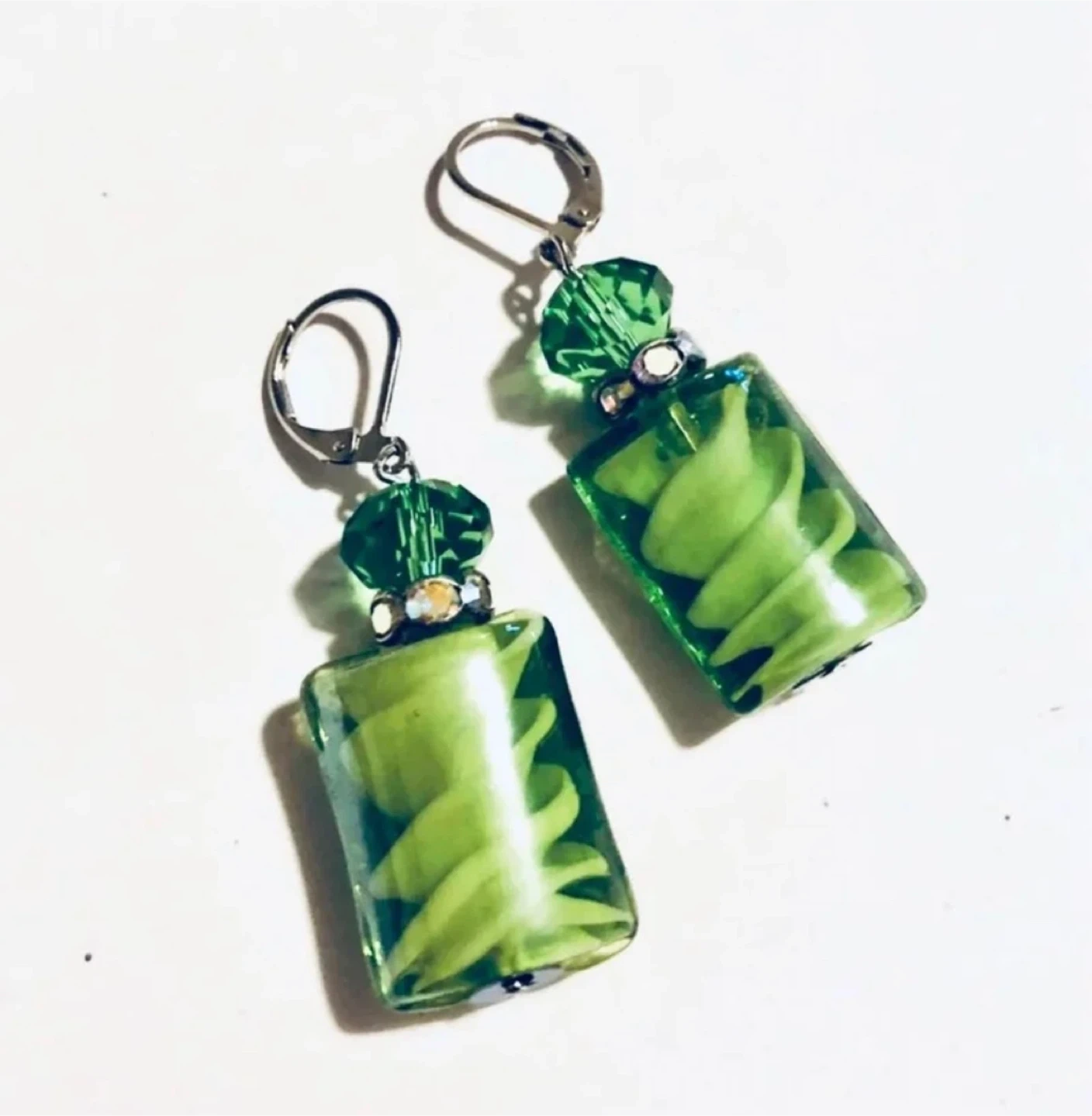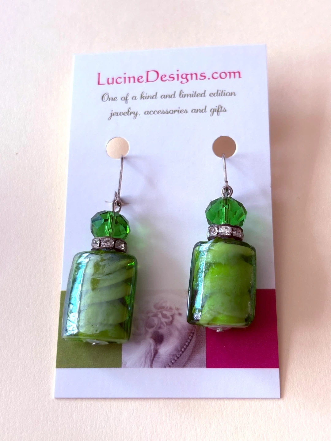 These are a pair of Lucine Designs earrings. They feature green glass and a unique design. They are one of a kind and a limited edition piece of jewelry, accessories and gifts!