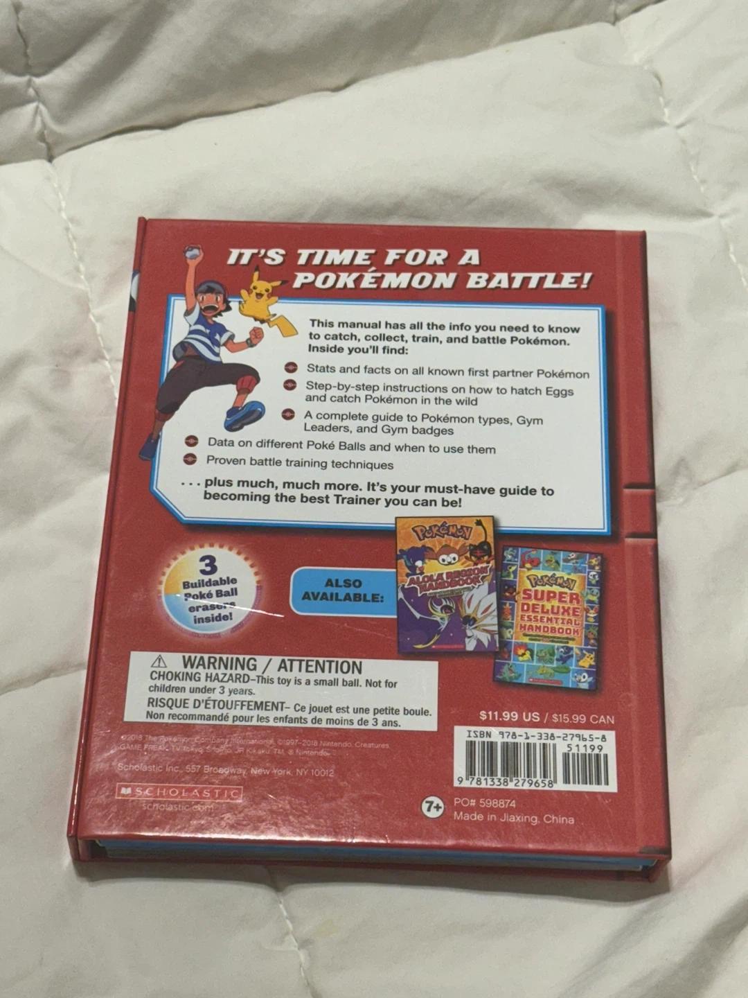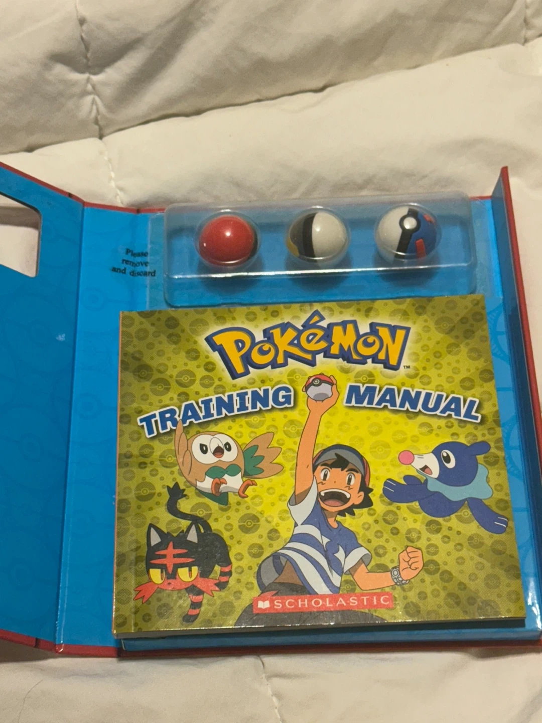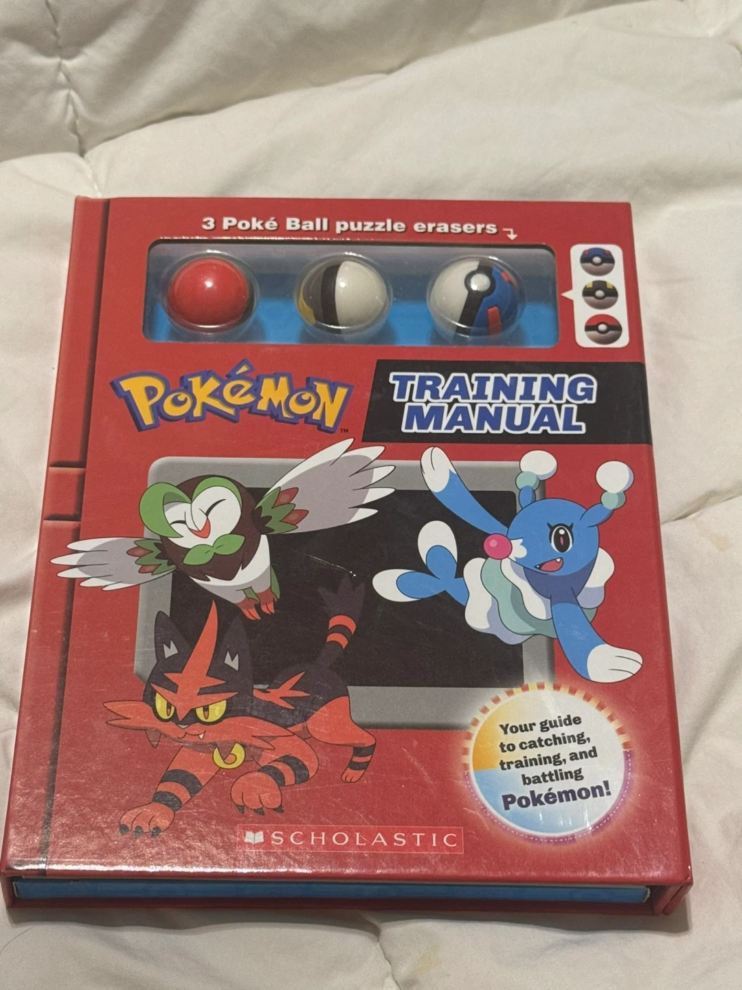 Pokémon Training Manual book, complete with 3 Poké Ball puzzle erasers! A guide to catching, training, and battling Pokémon! It has stats and facts on all known first partner Pokémon and a complete guide to Pokémon types, Gym leaders, and Gym badges! Originally priced at $15.99 CAN plus tax