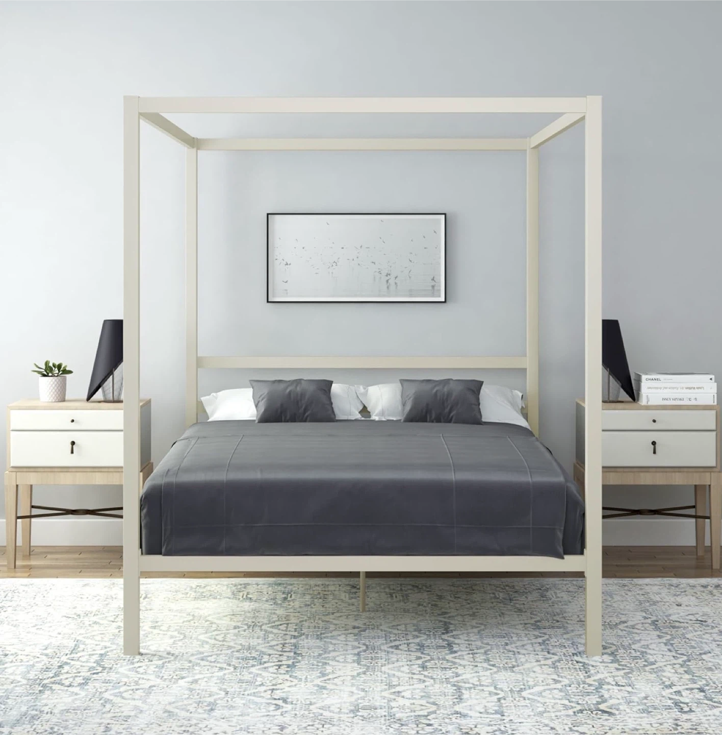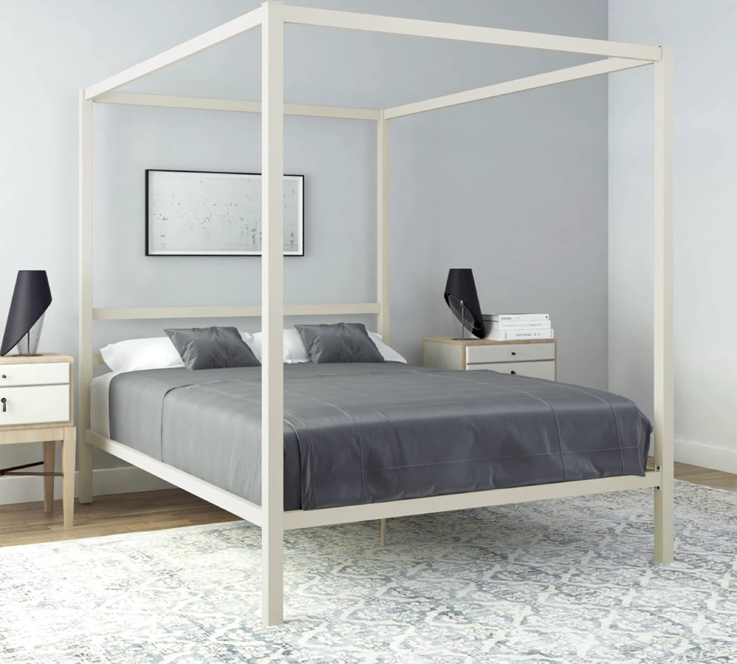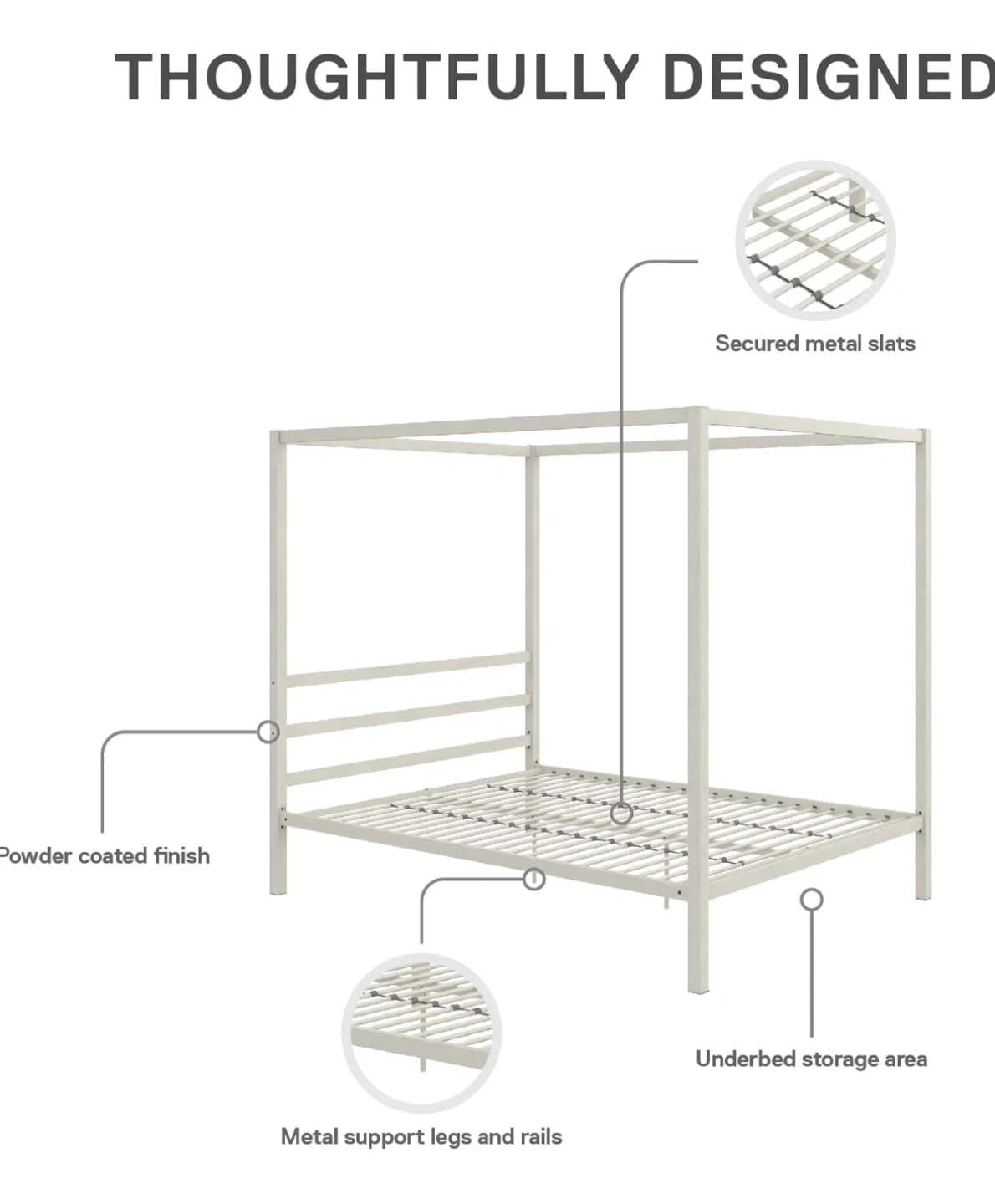 Selling a DHP Modern Metal Canopy Platform Bed in white. It has a minimalist headboard and four-poster design, with underbed storage space. It's a Queen size, and no box spring is needed. The bed features secured metal slats, metal support legs and rails, and a powder-coated finish. Dimensions are approximately 78.5" x 57" x 73.5".