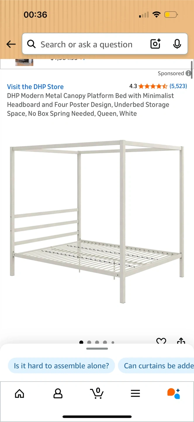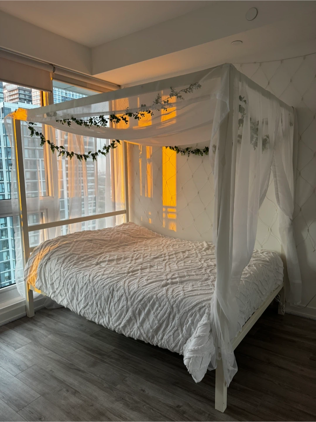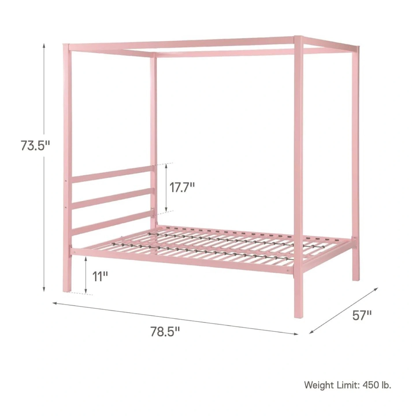 Selling a DHP Modern Metal Canopy Platform Bed in white. It has a minimalist headboard and four-poster design, with underbed storage space. It's a Queen size, and no box spring is needed. The bed features secured metal slats, metal support legs and rails, and a powder-coated finish. Dimensions are approximately 78.5" x 57" x 73.5".