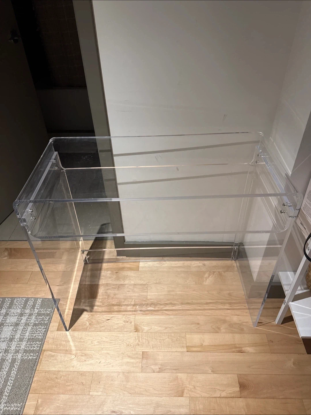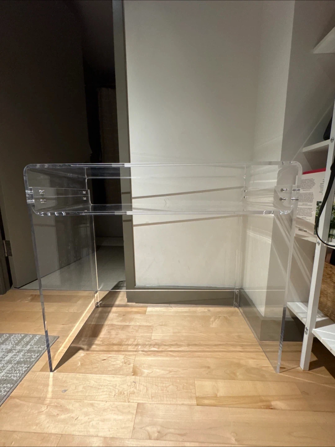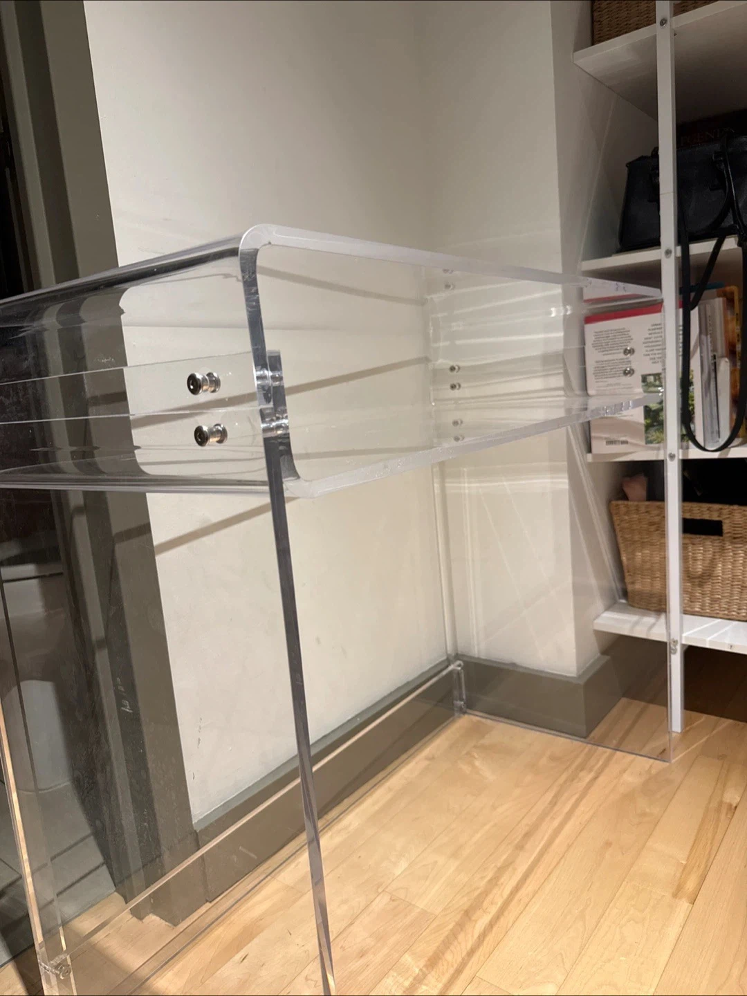 Selling a clear acrylic console desk! It measures 33.5 inches in width, 29.5 inches in height, and 15.7 inches in depth. This desk is perfect for a modern and minimalist aesthetic