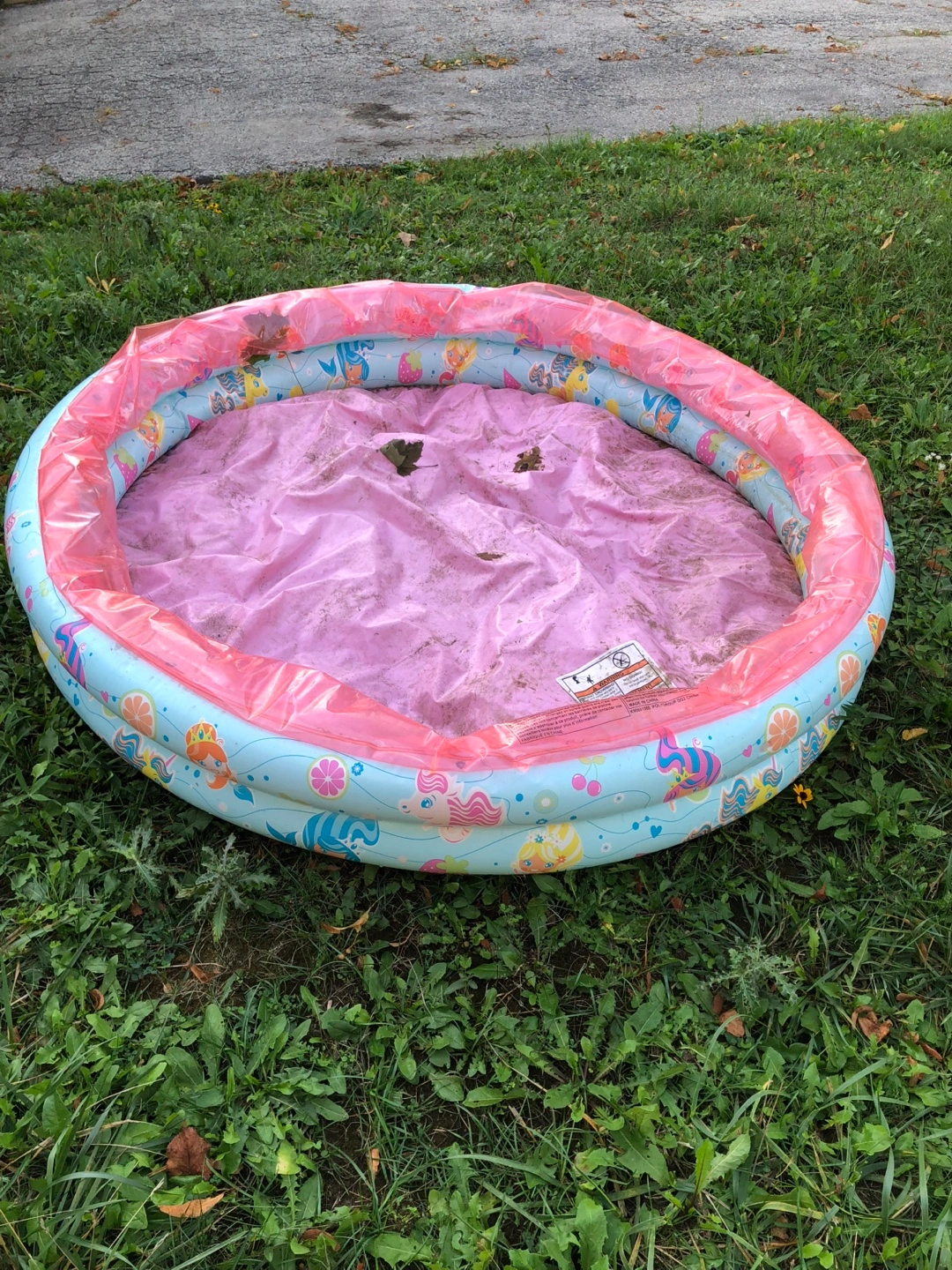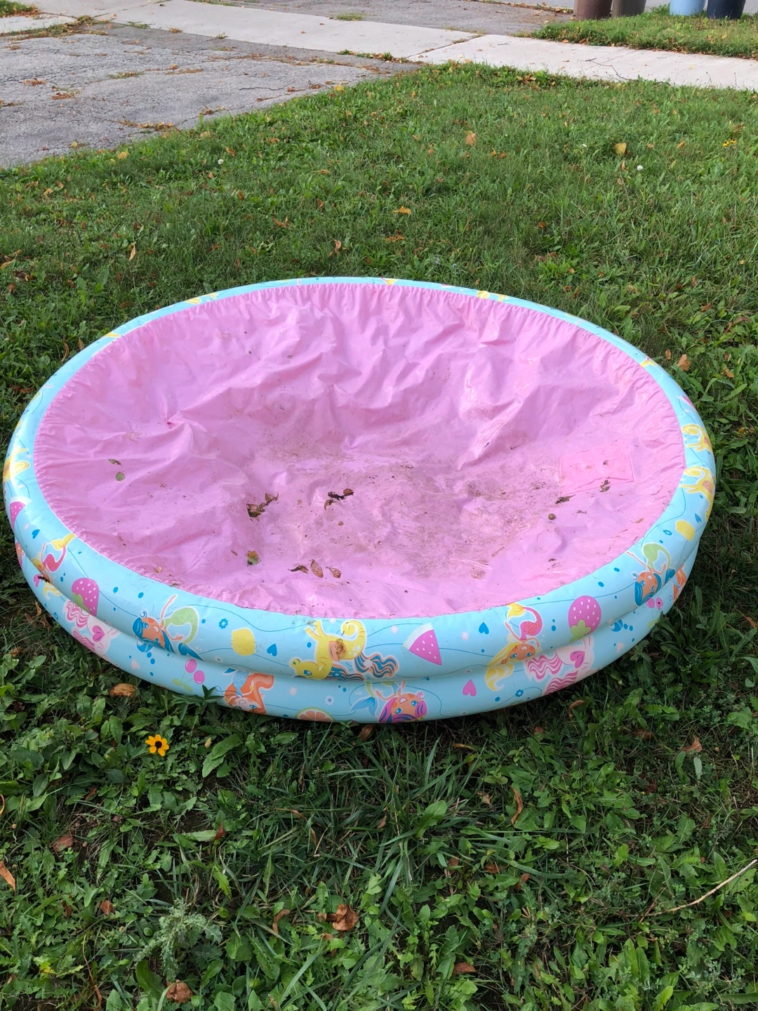 2285 feet in diameter. Selling a used My Little Pony inflatable pool. It's perfect for little ones to splash around in during the summer months! It has a cute design featuring My Little Pony characters. It is a bit dirty, but it can be cleaned up easily All sales are final.