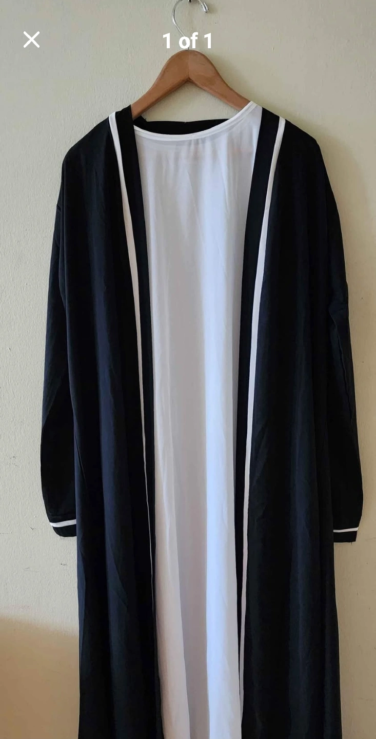 Here's a stylish long cardigan in black and white! It's perfect for layering and adding a touch of elegance to any outfit. The material is comfortable and has a nice drape. It's in great condition and ready for a new home!