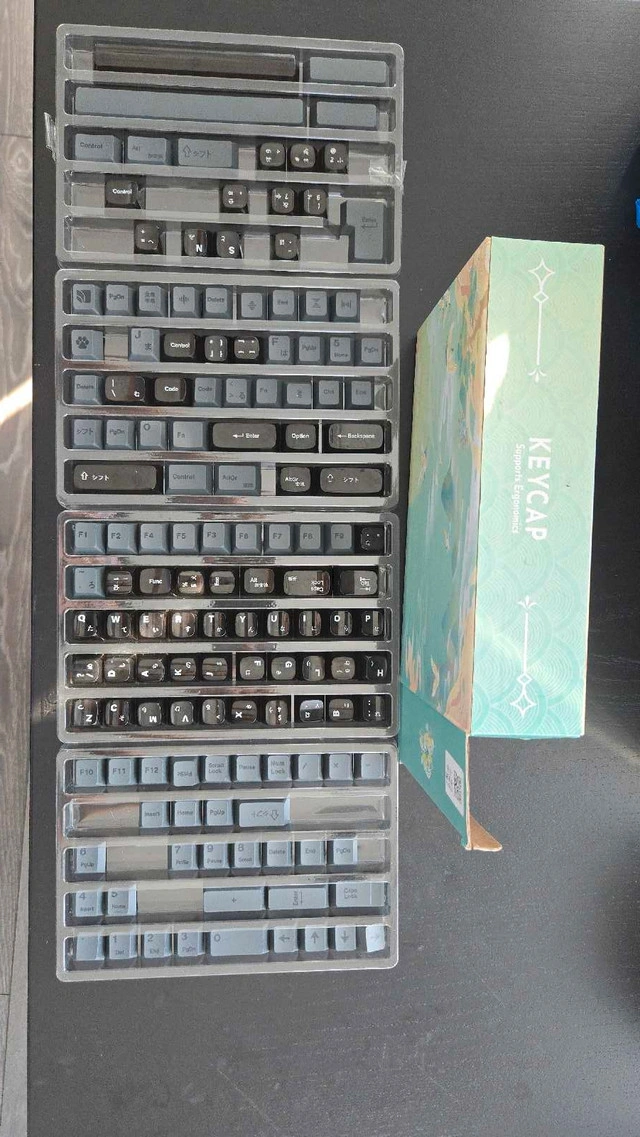 Selling a set of stylish keycaps, designed to give your mechanical keyboard a sleek, modern look. These keycaps are made from durable material, ensuring long-lasting use and resistance to wear. Upgrade your typing experience with these high-quality keycaps, perfect for gamers, programmers, and anyone who loves a personalized touch to their setup. * Material: Durable PBT * Compatibility: Fits most mechanical keyboards Spice up your setup with these keycaps; they’re just waiting to find their home on your keyboard! If you're seeing this ad, yes, they're still available!