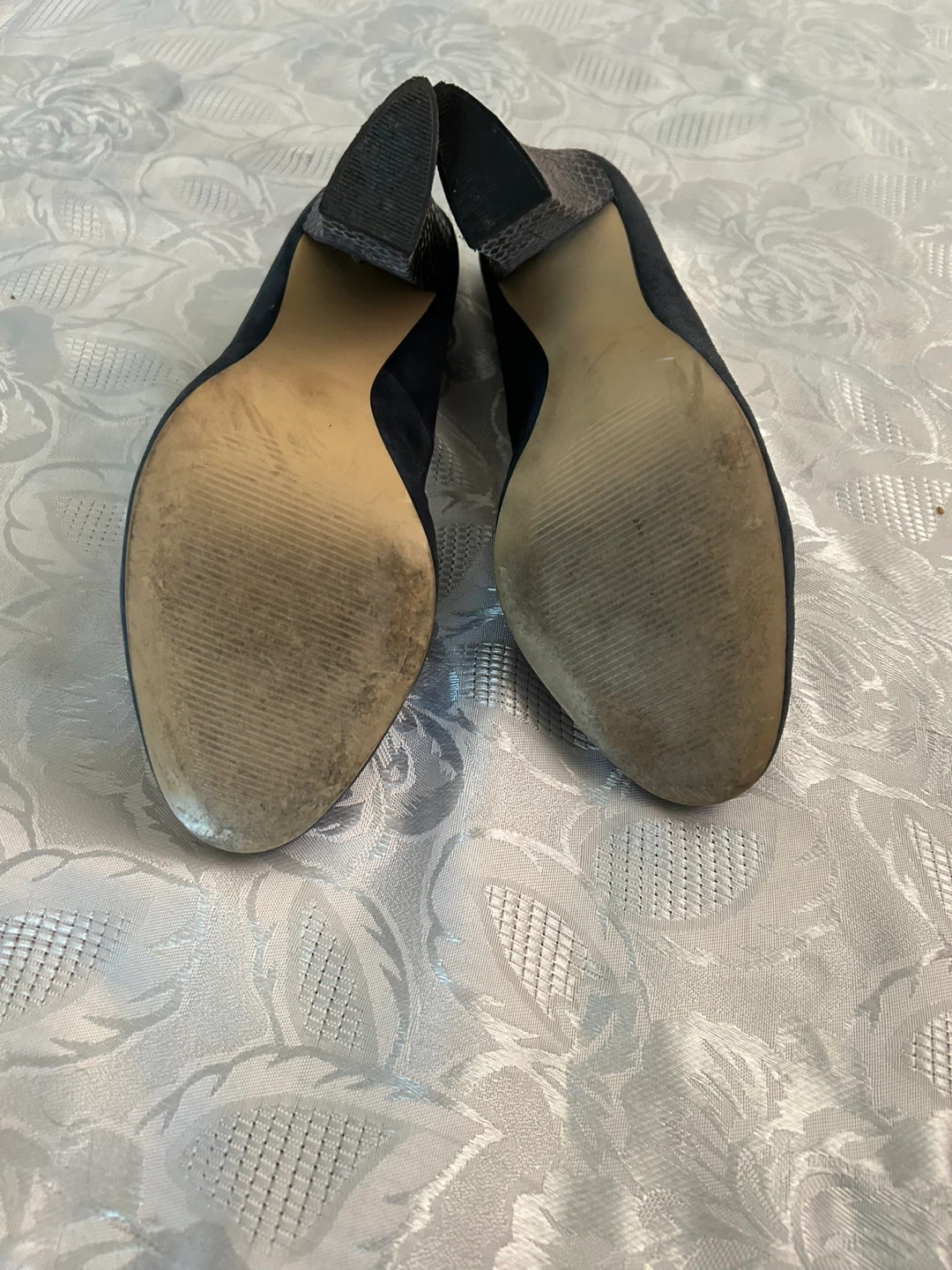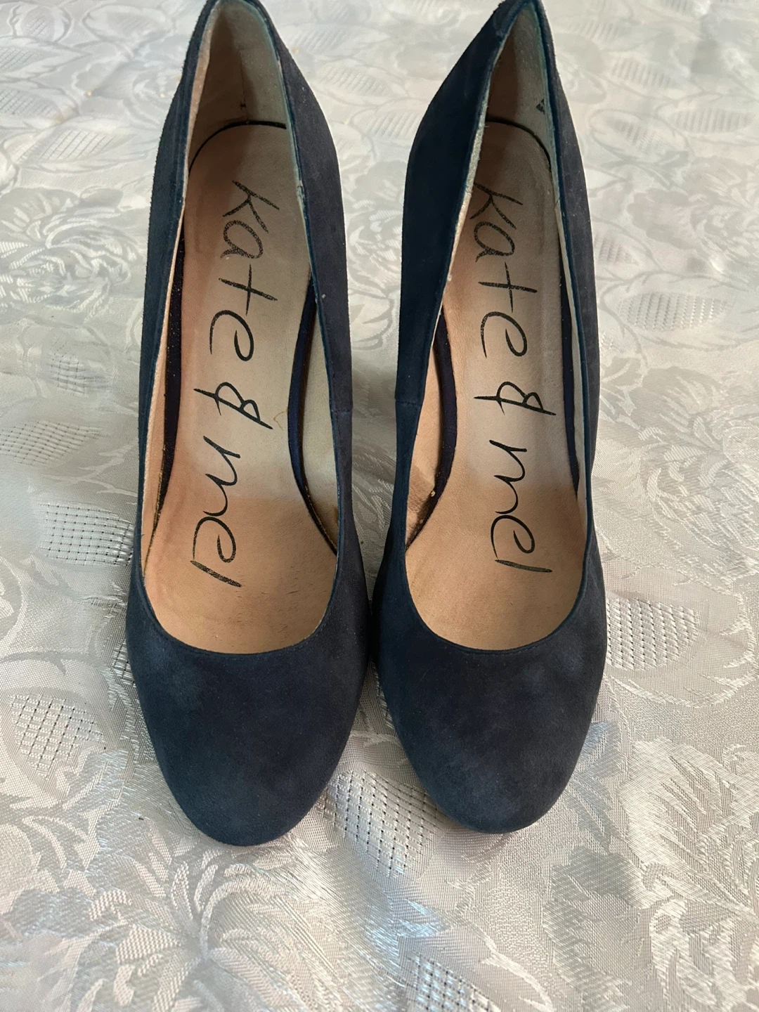 Selling a pair of Kate & Mel Navy suede heels. They have a unique snakeskin pattern on the heel. These are pre-loved and show some signs of wear on the soles, but still have lots of life left in them!