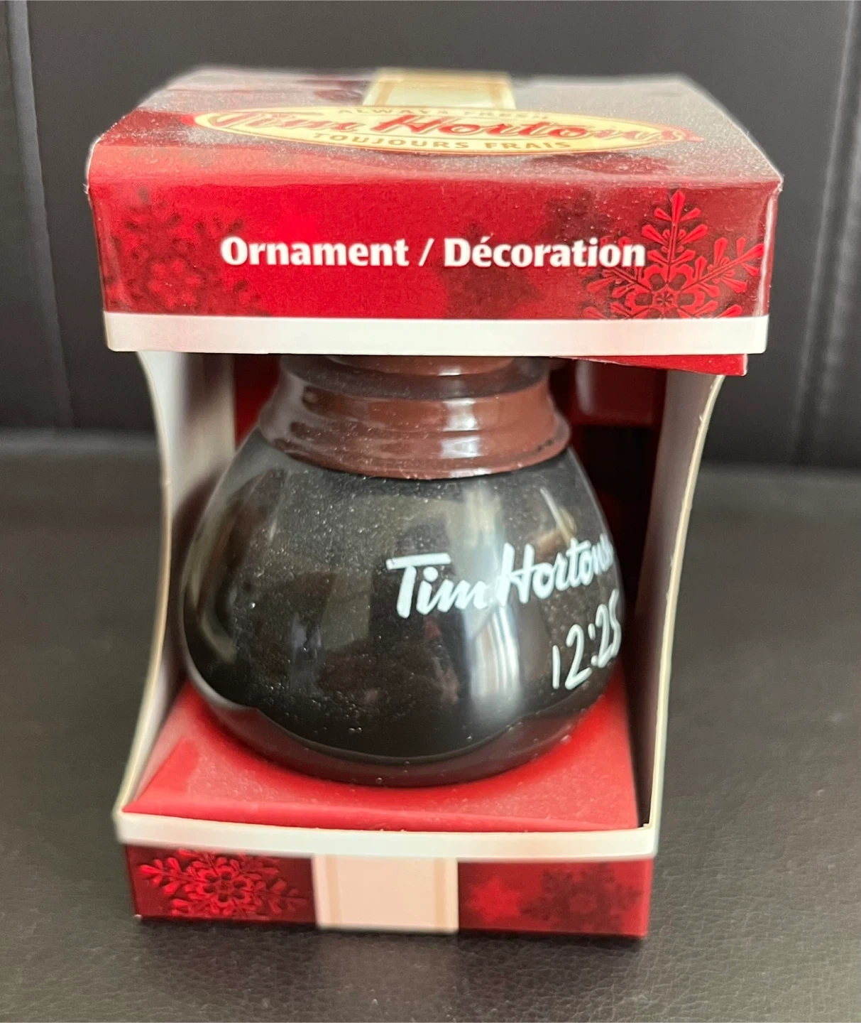 First let me just say that Tim Hortons did not skimp on quality on this ornament. On this ornament that is 3/4 full with what appears to be coffee inside, is there logo and marked for 12:25. Just like they do in the stores so that you know what time that pot was brewed. why don't all coffee houses do this? That would be so nice to see.
