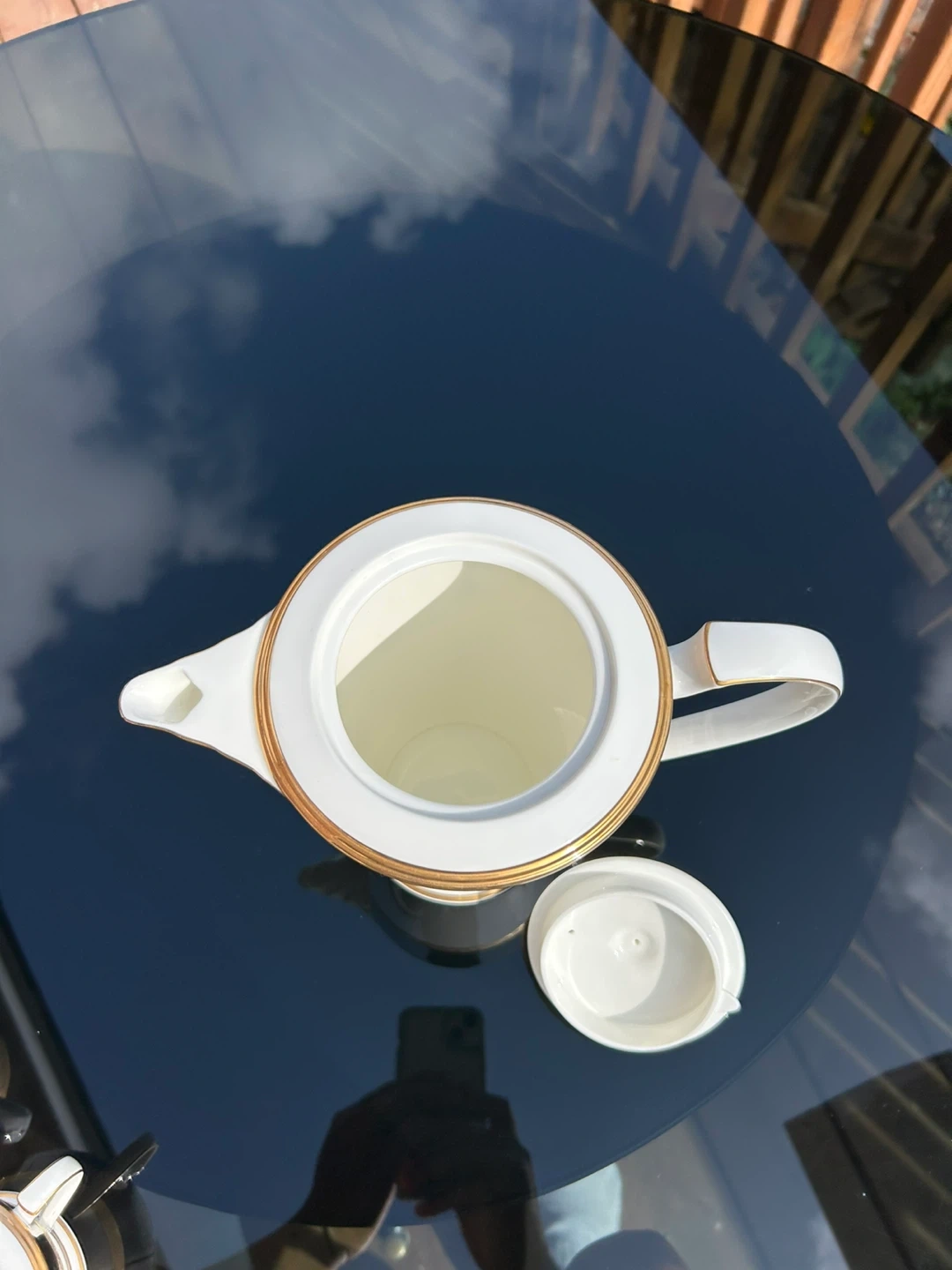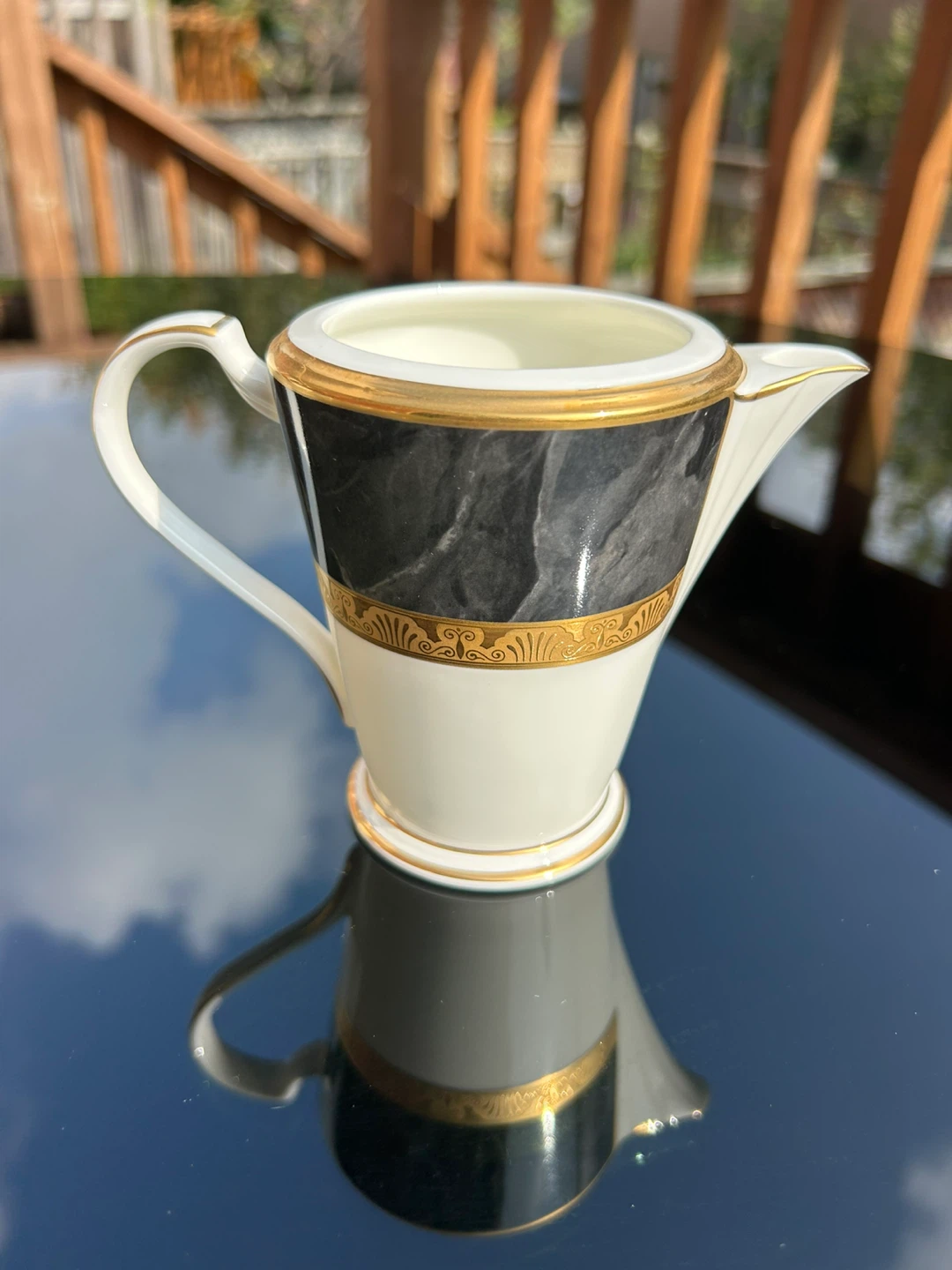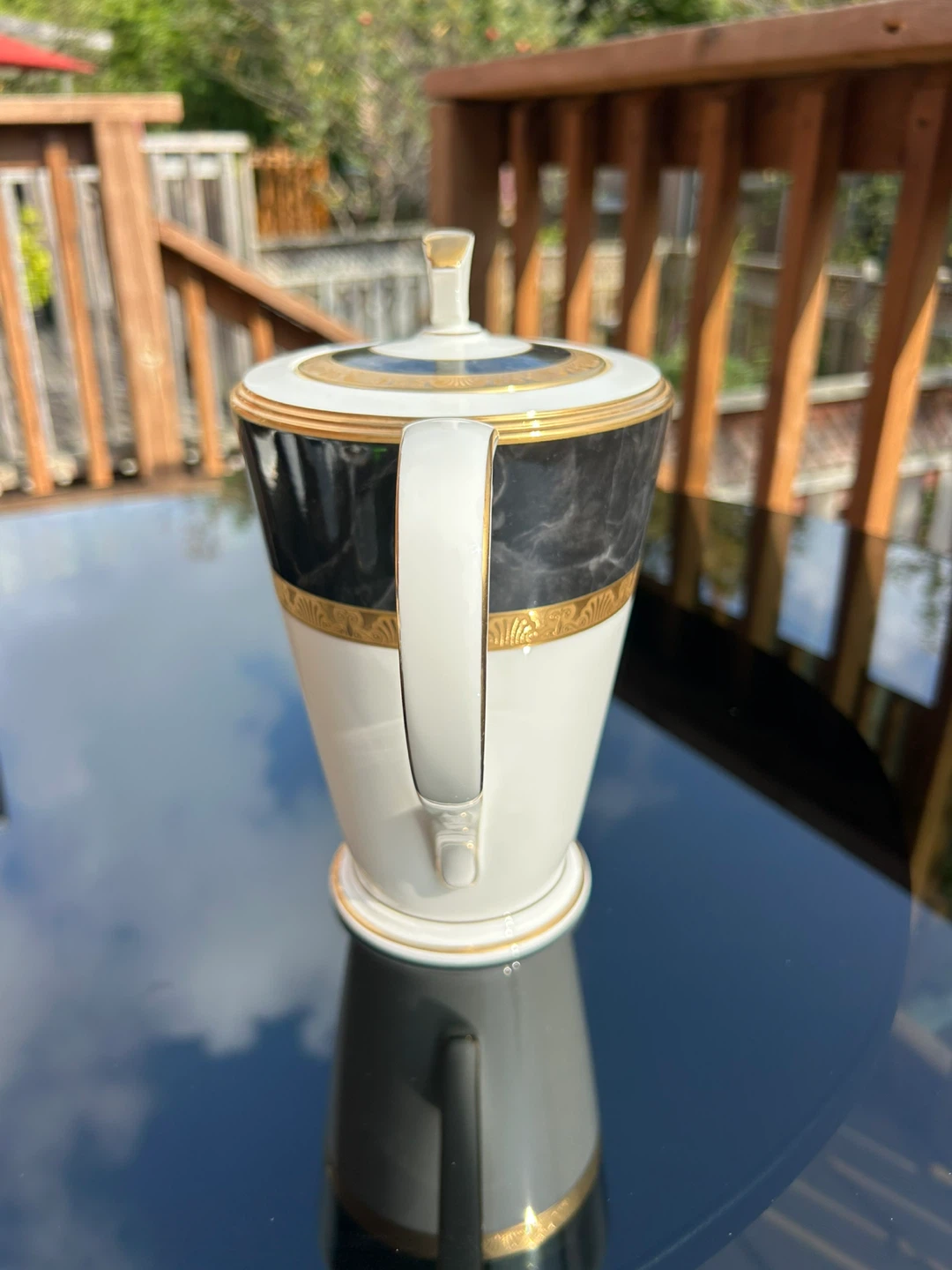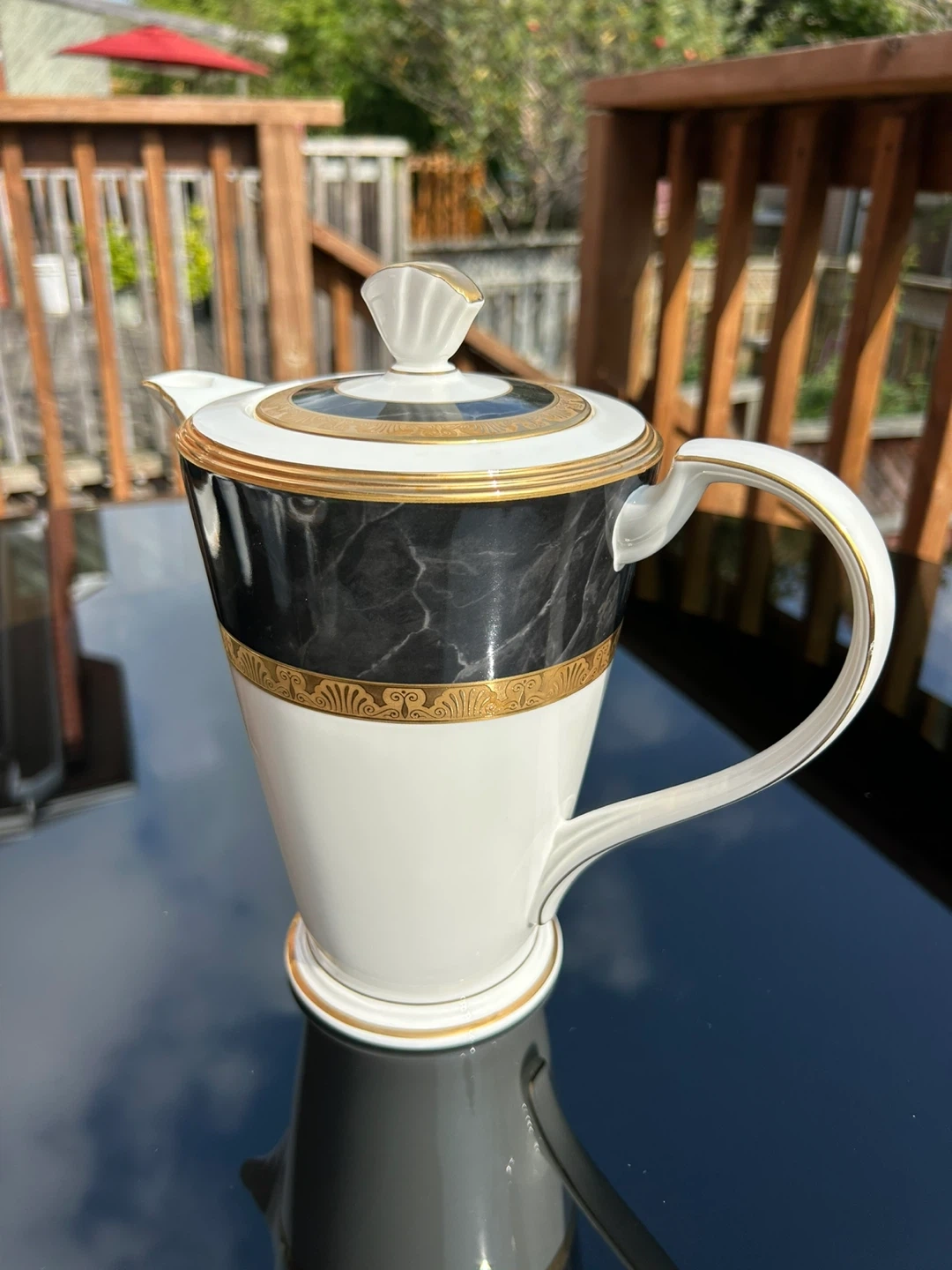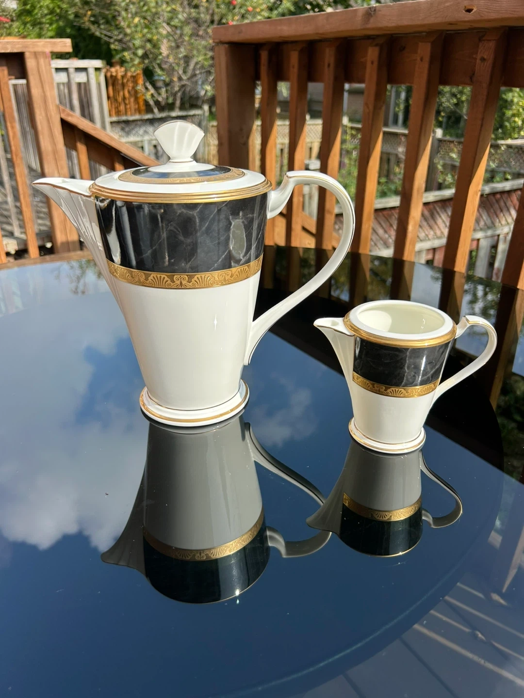 Selling a lovely porcelain coffee pot and creamer set. The set features a beautiful design with black marble-like accents and gold trim. Perfect for adding a touch of elegance to your coffee service.