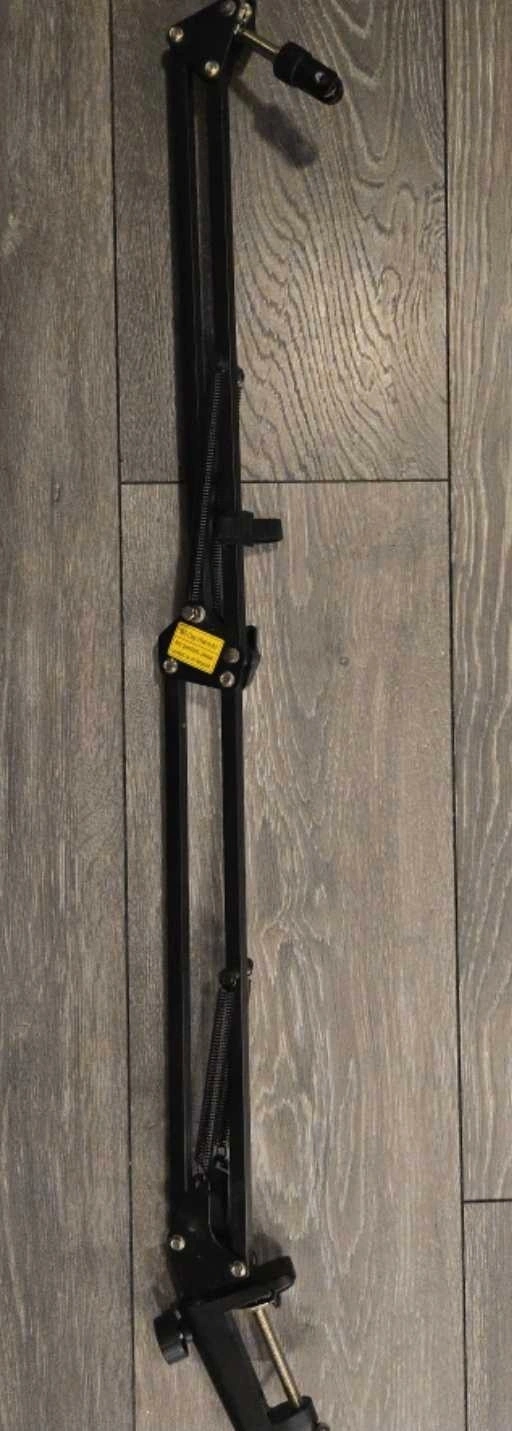Elevate your audio setup with this used microphone scissor arm stand, perfect for podcasts, broadcasts, or home studios! It's in good working condition, ready to bring flexibility and convenience to your recording space. Additional specs: * Adjustable arm for optimal positioning * Sturdy clamp base for secure mounting * Metal construction for durability. This microphone stand is priced to sell, offering excellent value for its quality and functionality. This microphone stand is waiting for a new home!