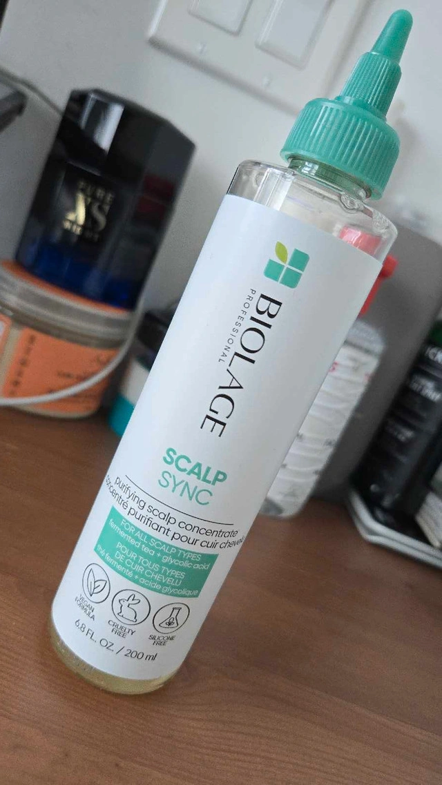I'm selling a bottle of Biolage Scalp Sync Purifying Scalp Concentrate, a treatment designed to clarify and refresh the scalp. This concentrate helps remove impurities and excess oil, promoting a healthier scalp environment. The bottle has been gently used, with approximately 80% of the product remaining. Here are some of its key features: * Formulated to purify and balance the scalp * Removes excess oil and impurities * Promotes a healthy scalp environment * Suitable for all hair types
