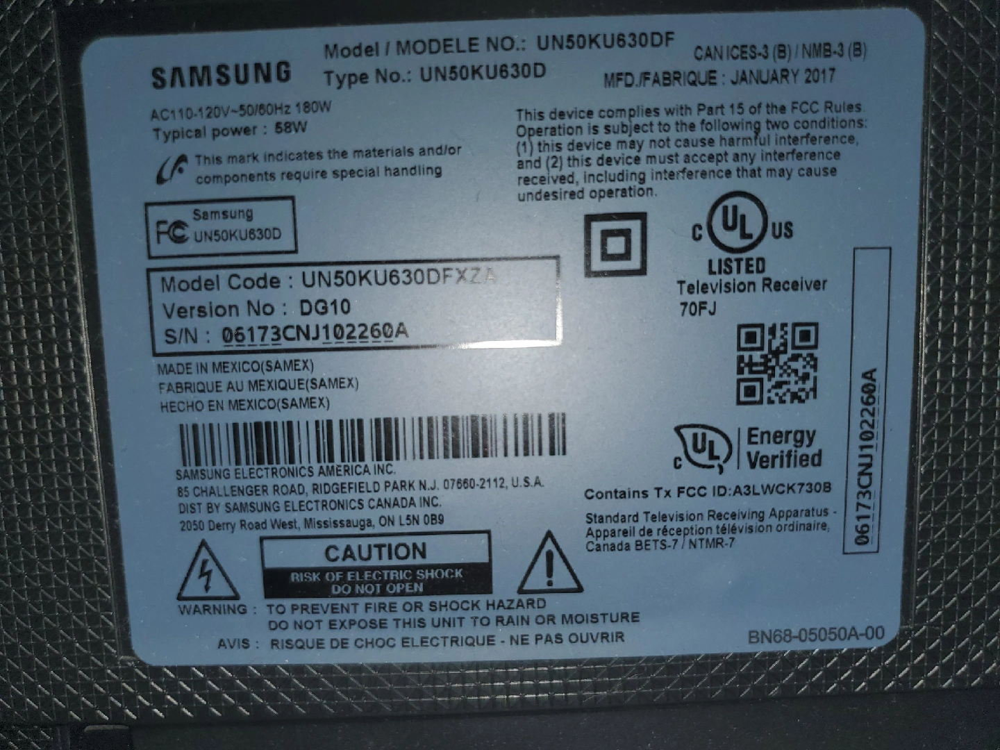 Selling a Samsung 50 inch TV, model number UN50KU630D. It's in good working condition and ready for a new home. This model was manufactured in January 2017.