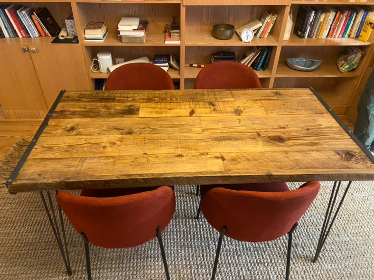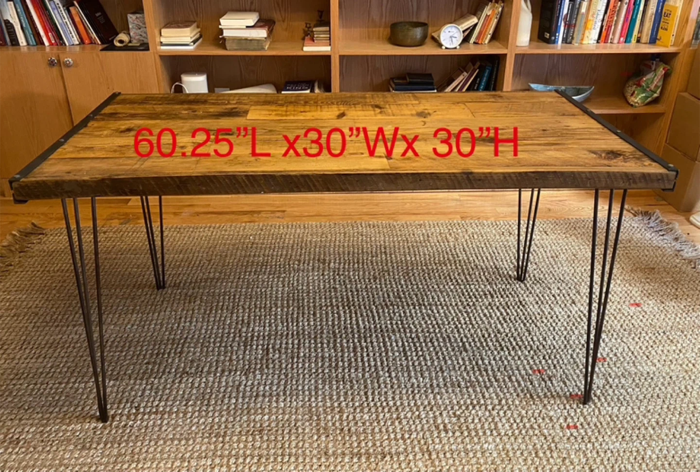 Selling a rustic wood dining table. It measures 60.25 inches in length, 30 inches in width, and 30 inches in height. Perfect for adding a touch of farmhouse charm to your dining space!