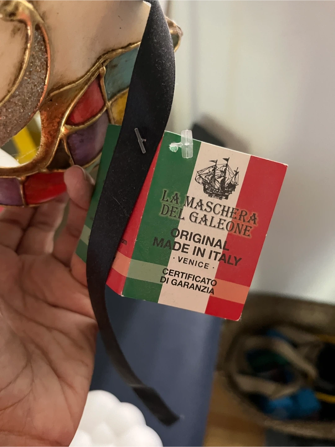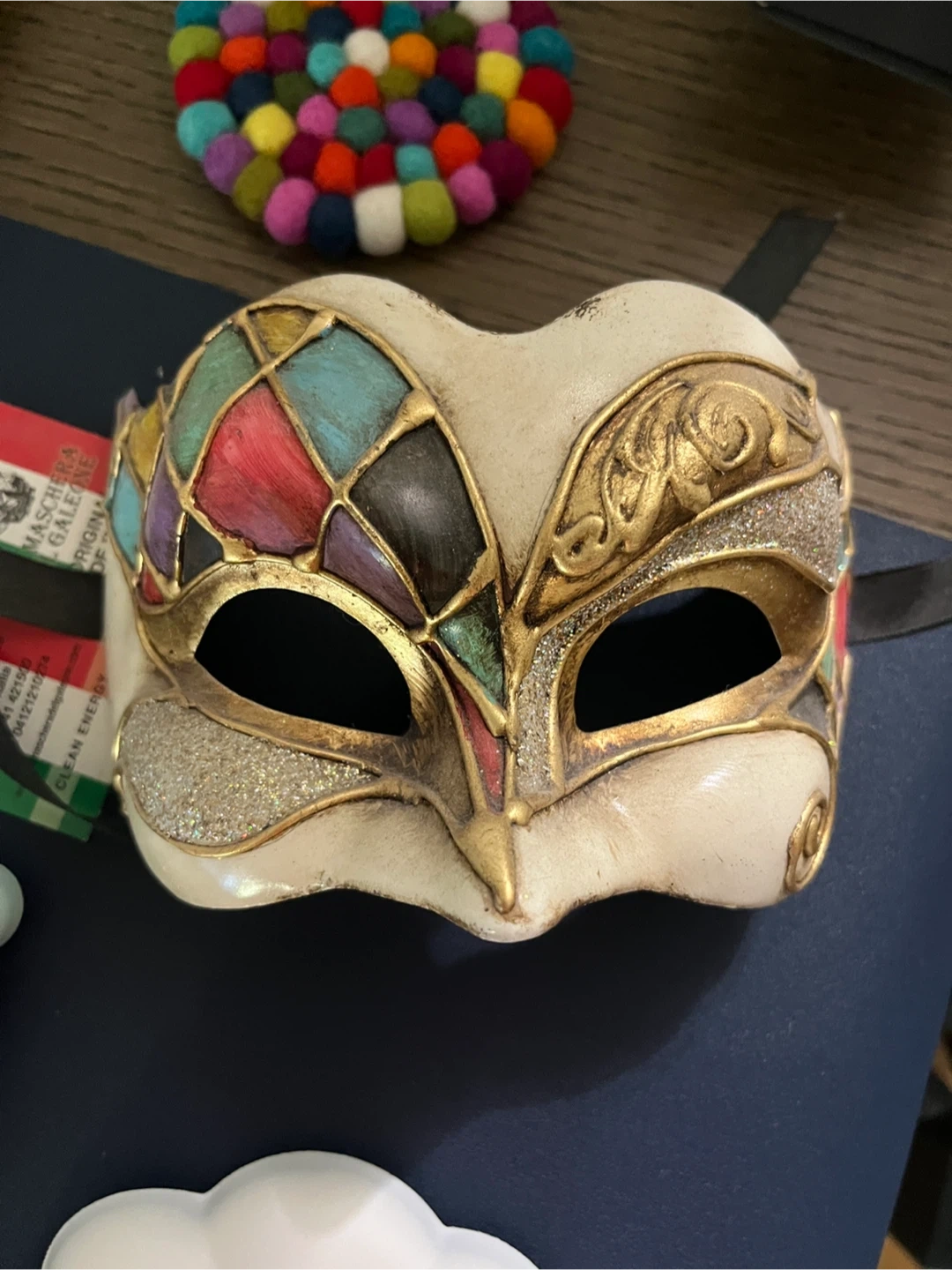 Selling a beautiful Venetian mask by La Maschera Del Galeone, originally made in Italy. It's hand painted and in great condition!