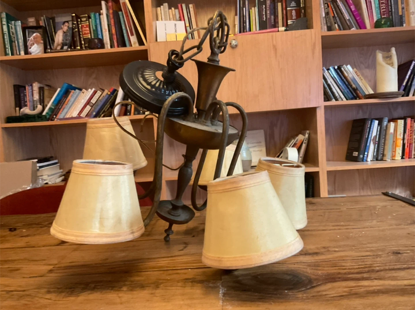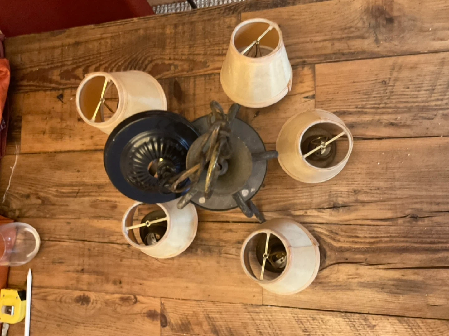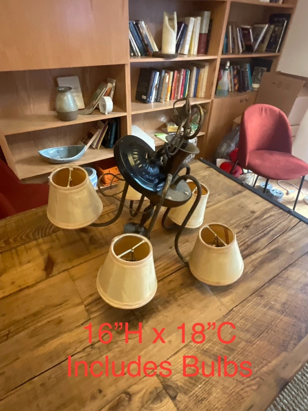 Selling a chandelier that measures 16 inches in height and 18 inches in circumference. It also includes the bulbs