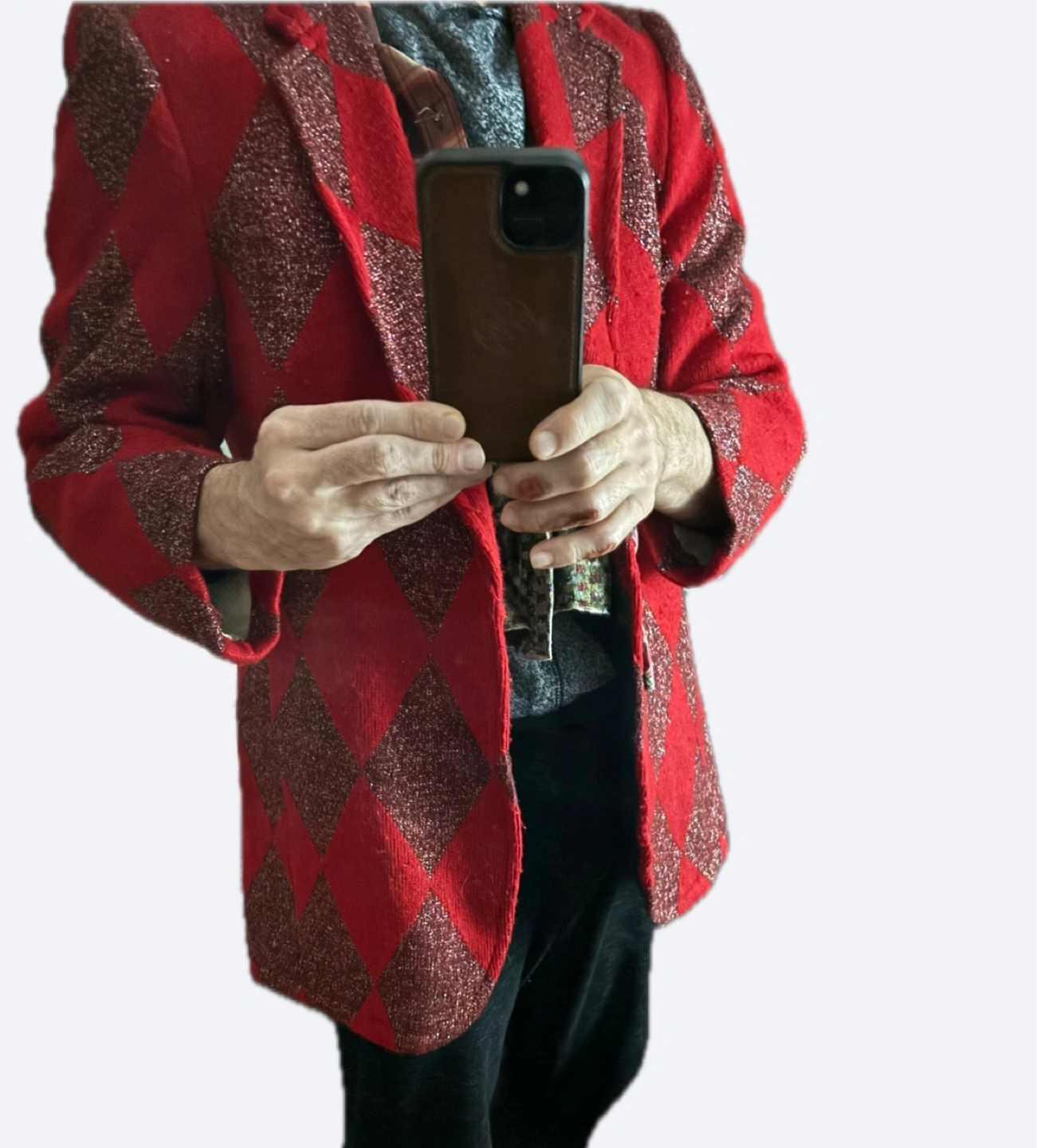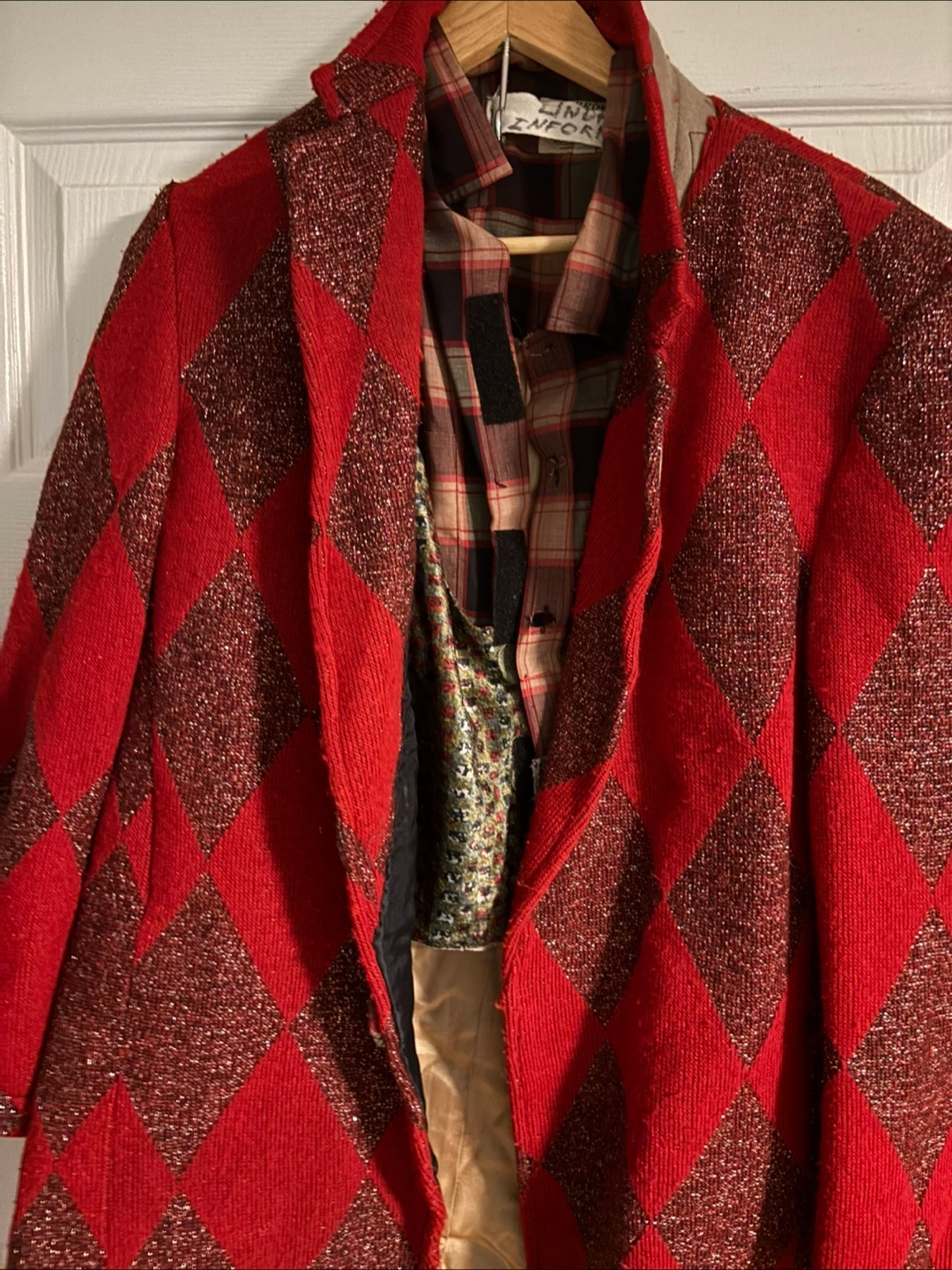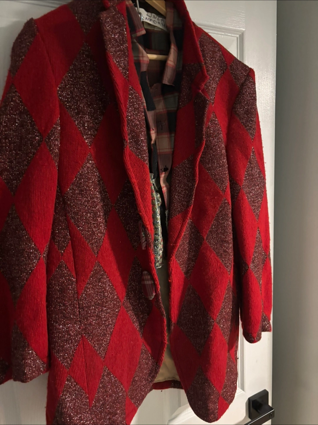 Here's a Linda Lundstrom jacket with a unique red and diamond pattern! It's in great shape and ready for a new home. Perfect for adding a pop of colour and style to your wardrobe