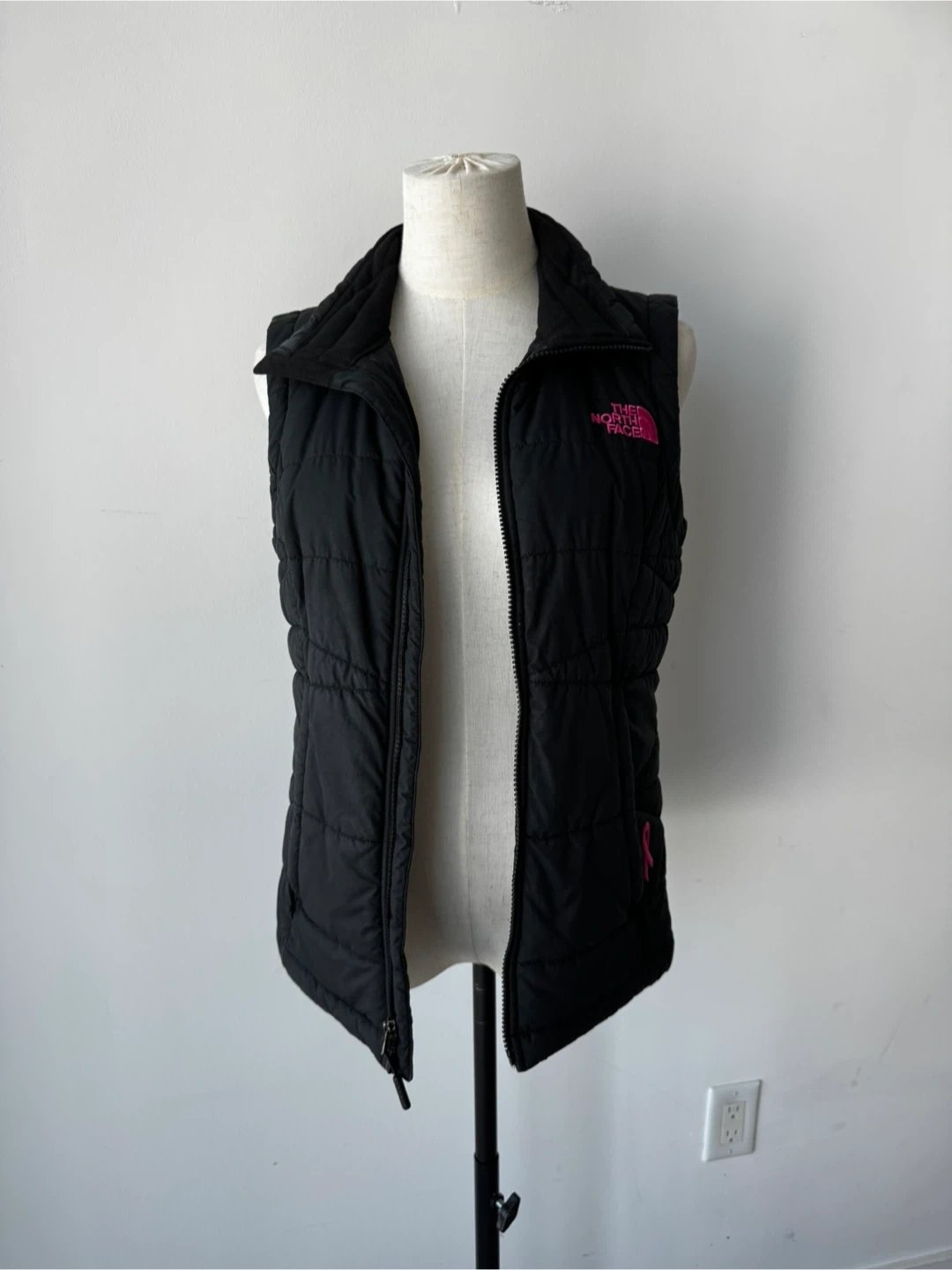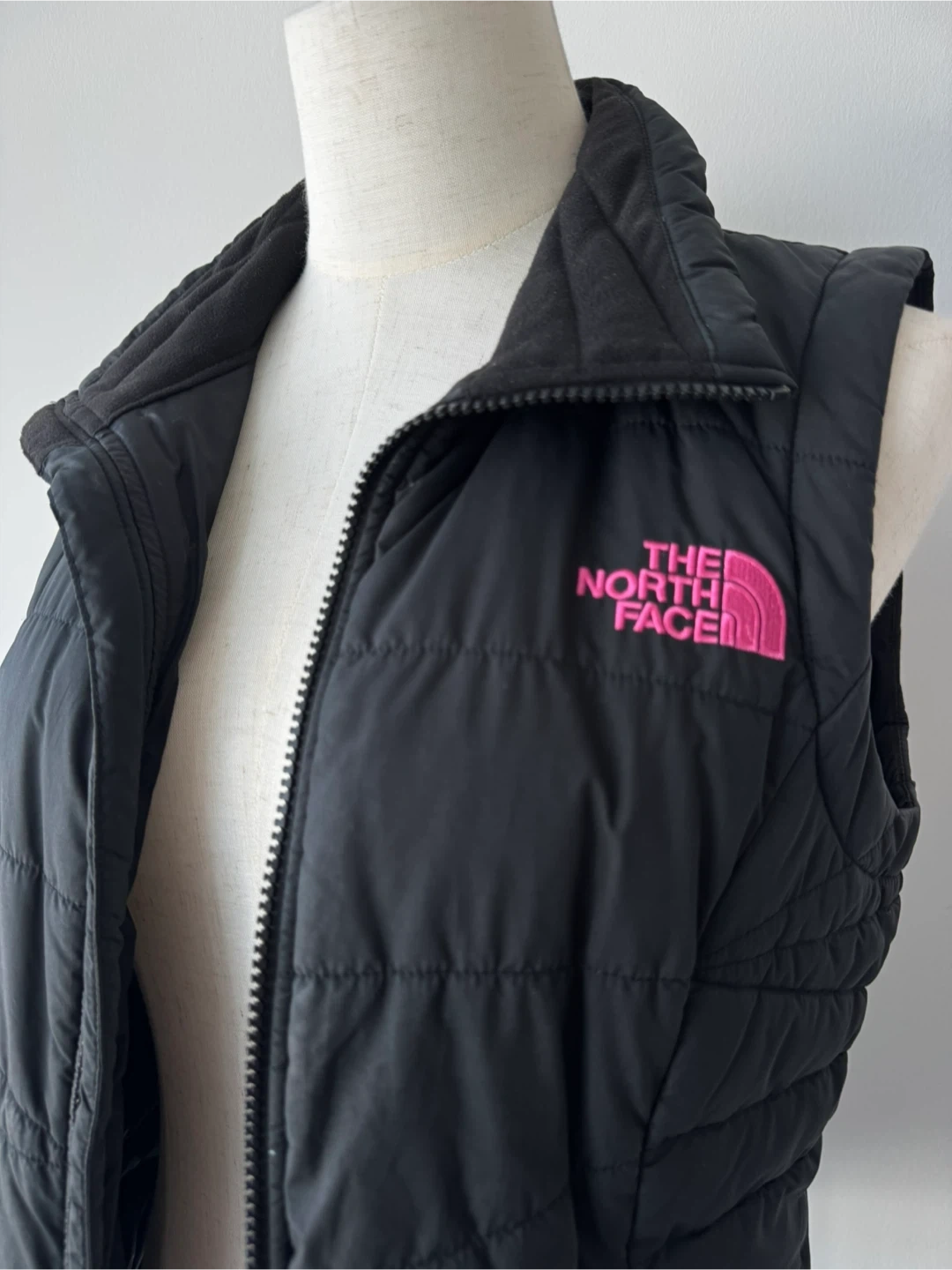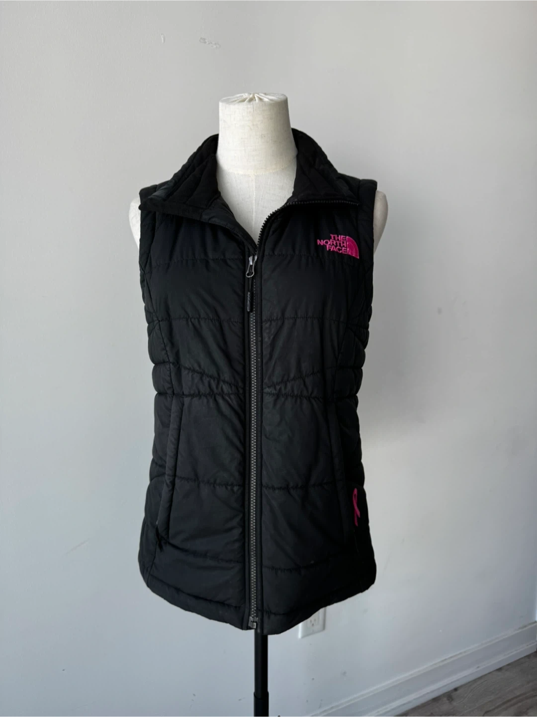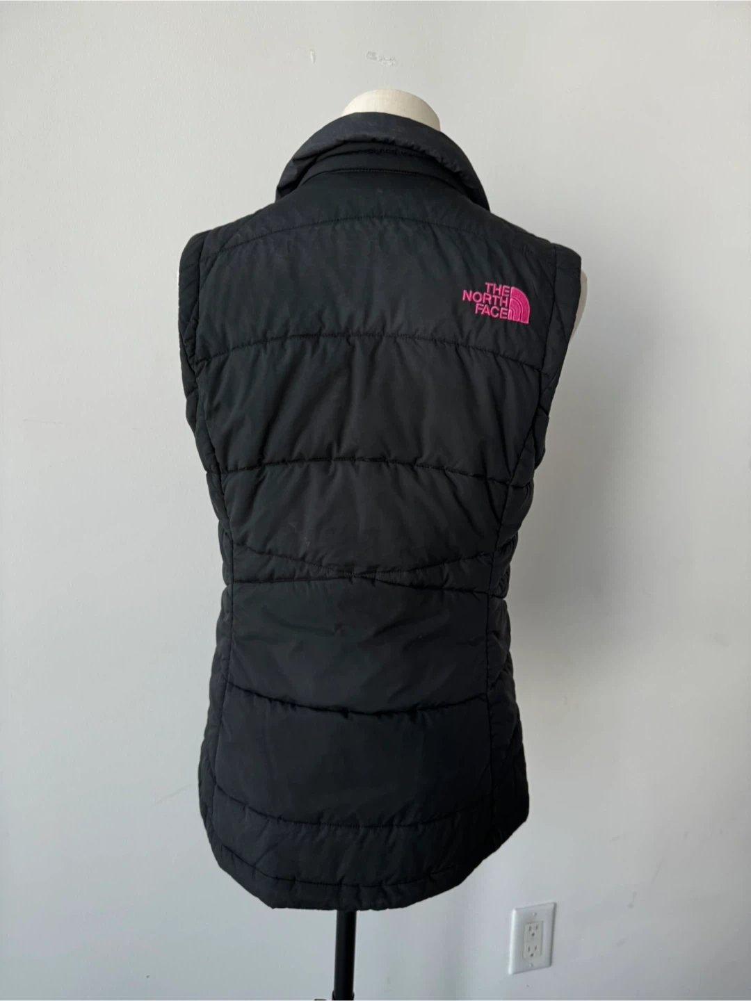 Selling a gently used black puffer vest from The North Face. It's in great shape and perfect for layering during the cooler months. The vest features the iconic North Face logo in pink. A great addition to any wardrobe!