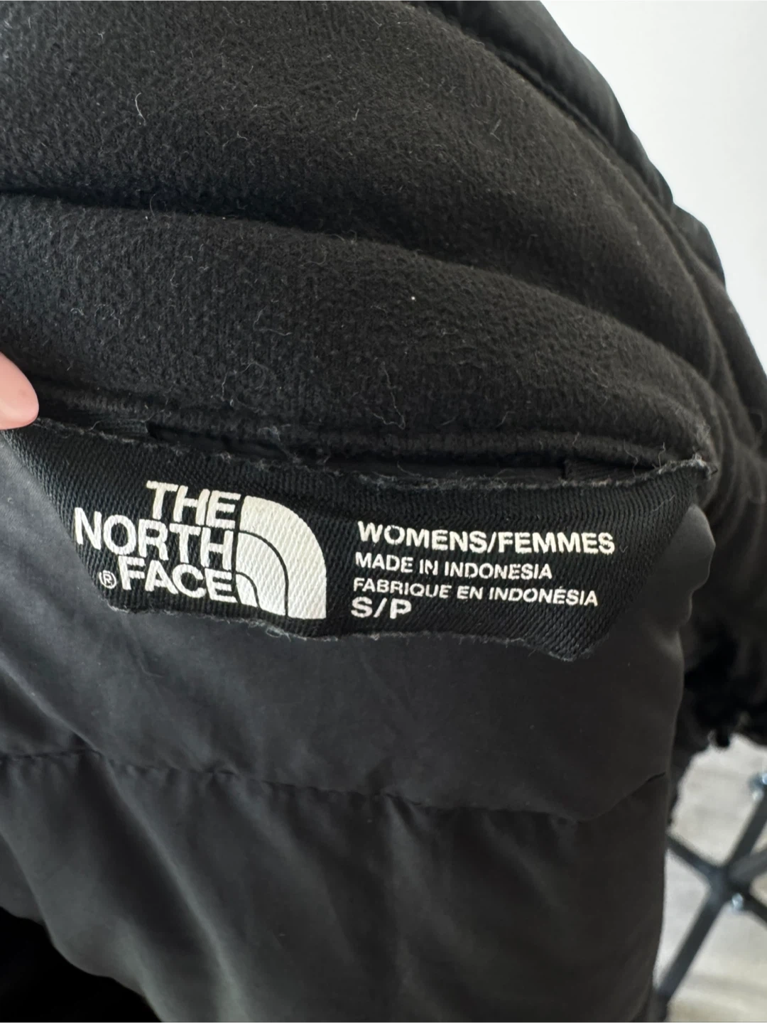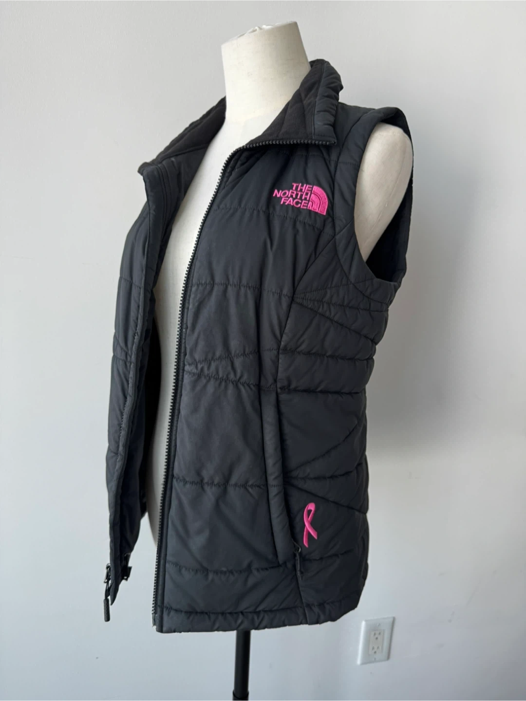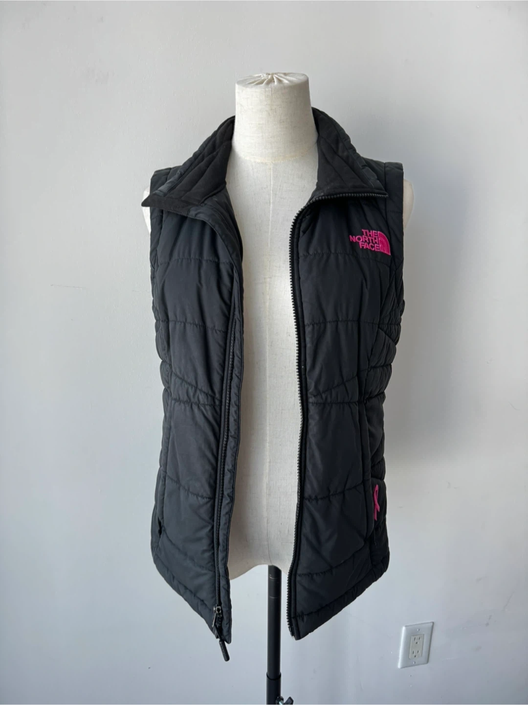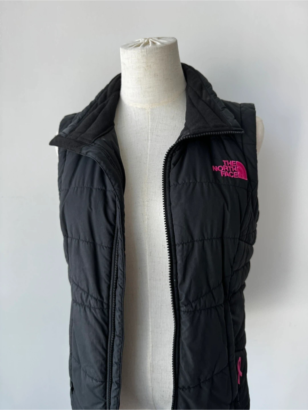 Selling a gently used black puffer vest from The North Face. It's in great shape and perfect for layering during the cooler months. The vest features the iconic North Face logo in pink. A great addition to any wardrobe!