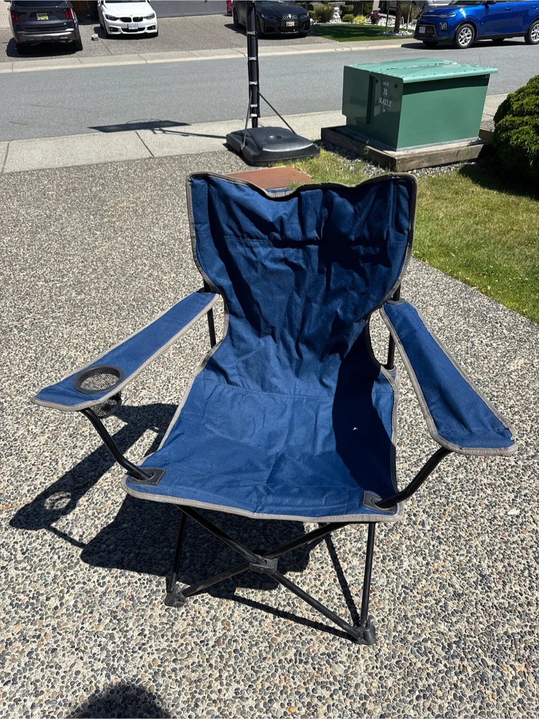 Here's a blue folding camping chair, perfect for your outdoor adventures! It's lightweight and easy to carry, making it ideal for camping, picnics, or just relaxing in the backyard. It also has a convenient cup holder to keep your drink secure. The chair is in great condition and ready for its next adventure