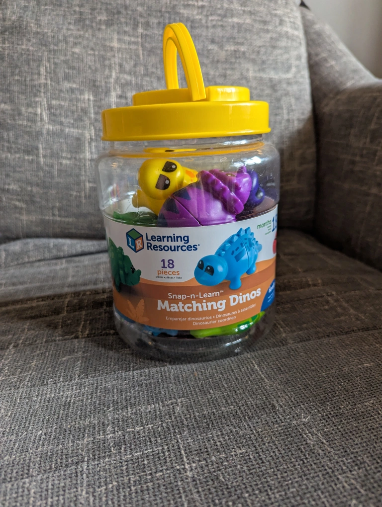 I'm selling a Learning Resources Snap-n-Learn Matching Dinos set! It comes with 18 pieces. This is great for kids aged 18+ months...matches the colours, as well as the shapes on the dinos backs. great condition, used only for educational purposes only.