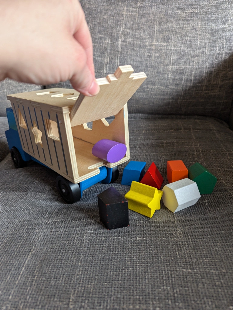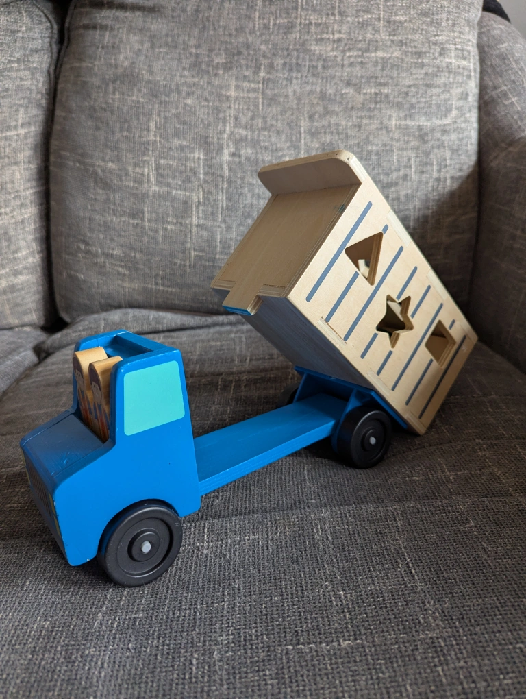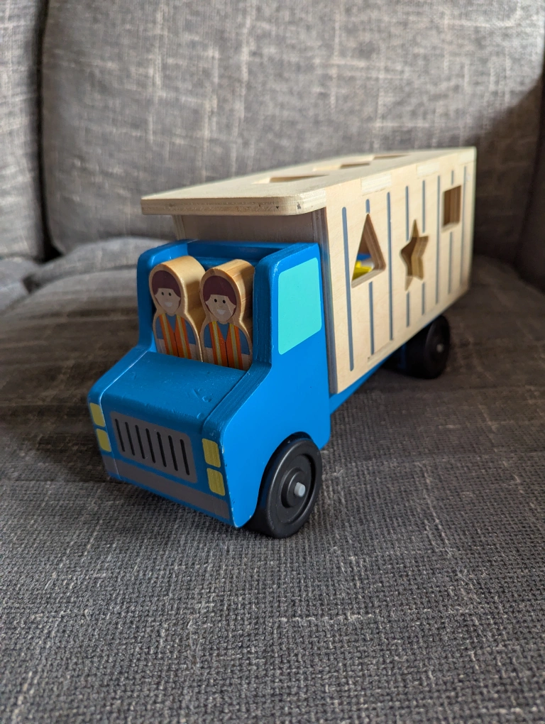 Here's a cute wooden shape sorter truck that's perfect for little ones! It comes with various shaped blocks to fit into the corresponding holes on the truck bed. The truck is in great condition and ready for a new home to provide hours of fun and learning...currently cannot find the brown square piece which will reflect in price. If found, I will update AD!