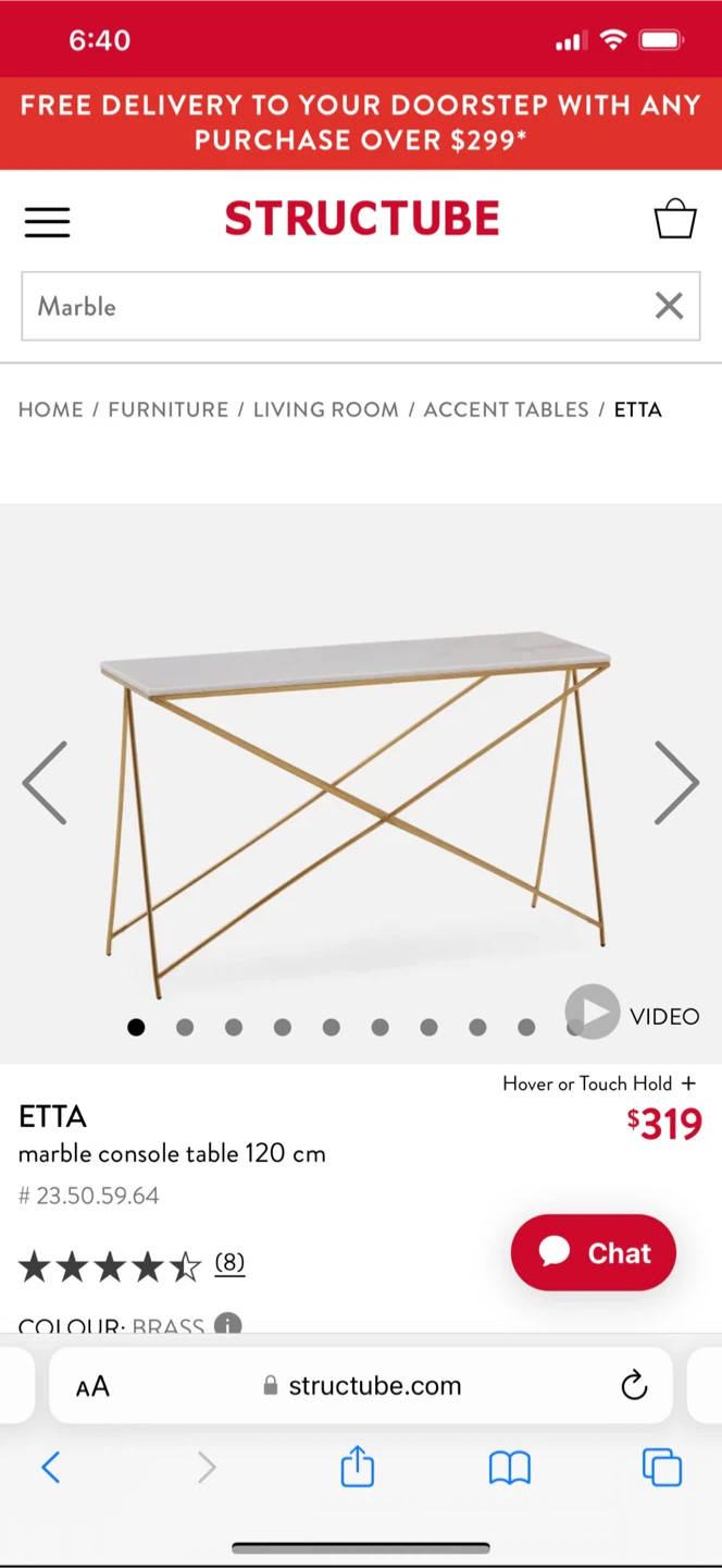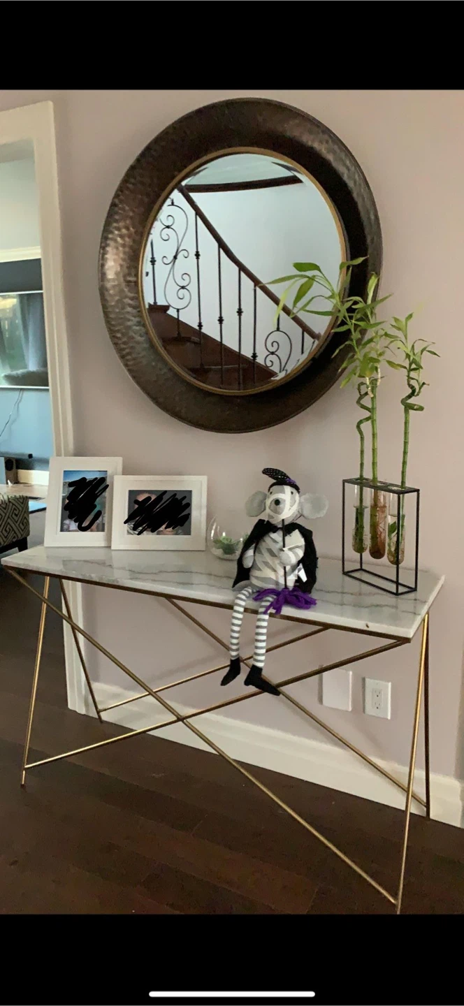 Selling a Structube Etta marble console table. It's 120 cm wide and has a brass-coloured frame. This table originally retailed for $319.