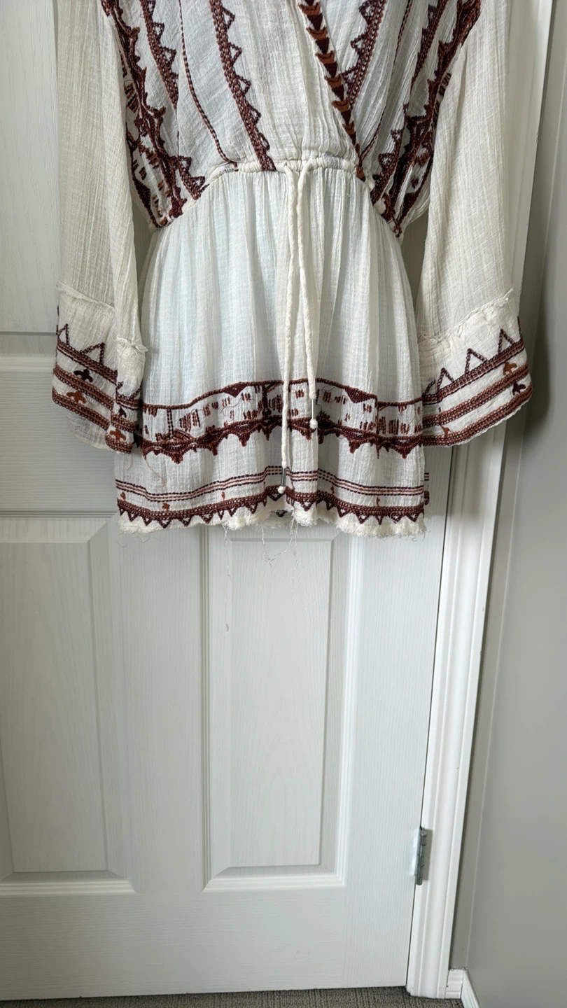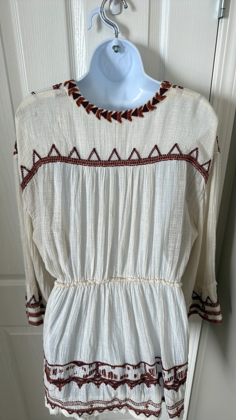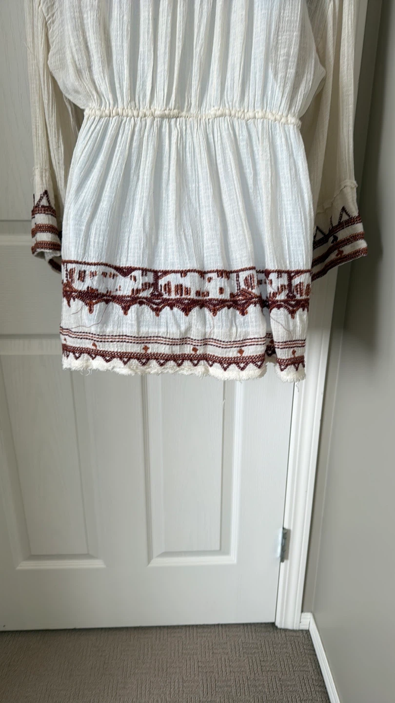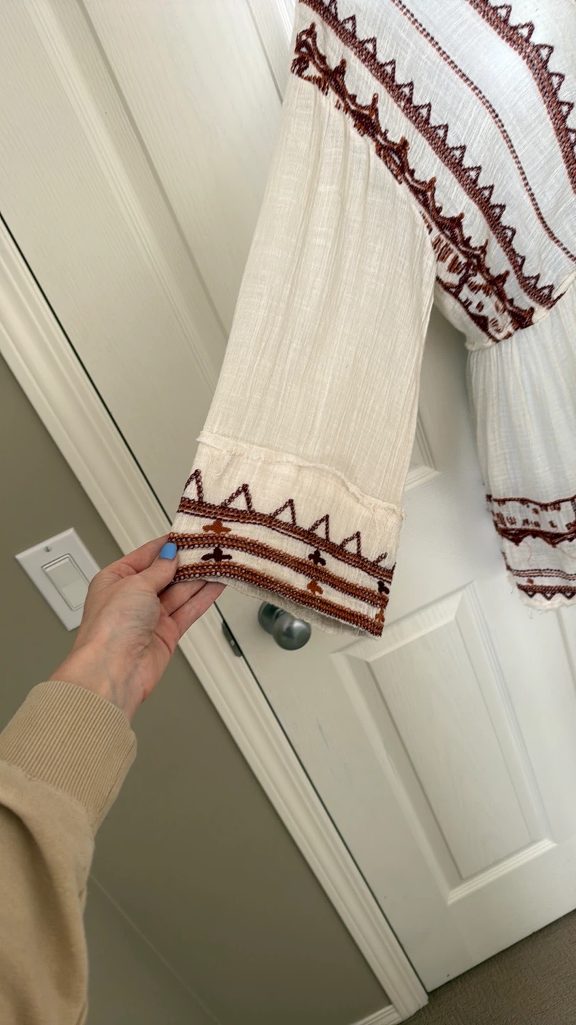 Great condition colorful embroidered trim details V-neck Long sleeves Slips on over head 59% cotton, 41% rayon Hand wash Fit: this style fits true to size Size: XS Bust : approx 20" Length : approx 32” Smoke free home Pick up in Wolf Willow SE