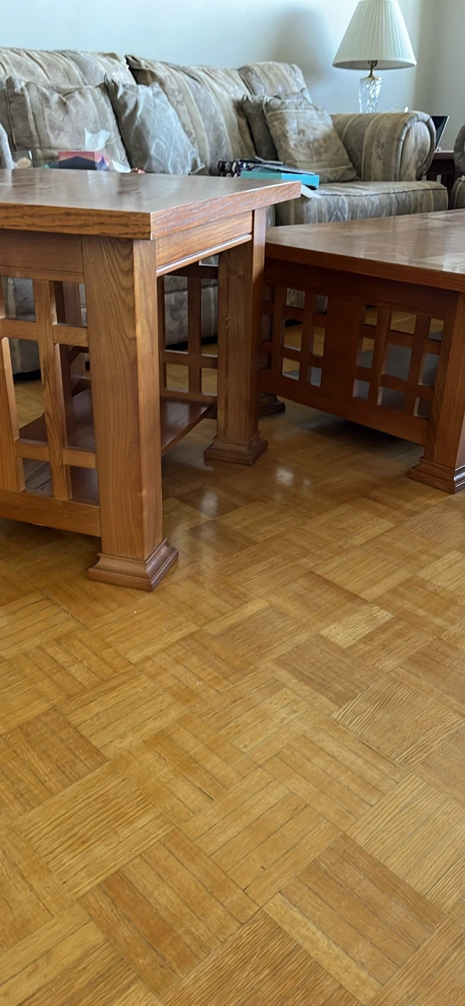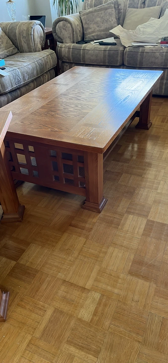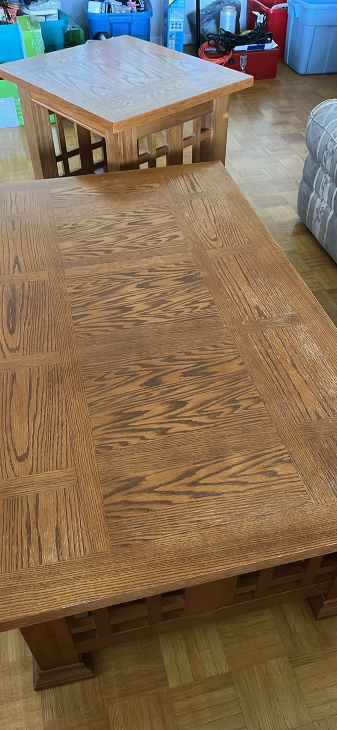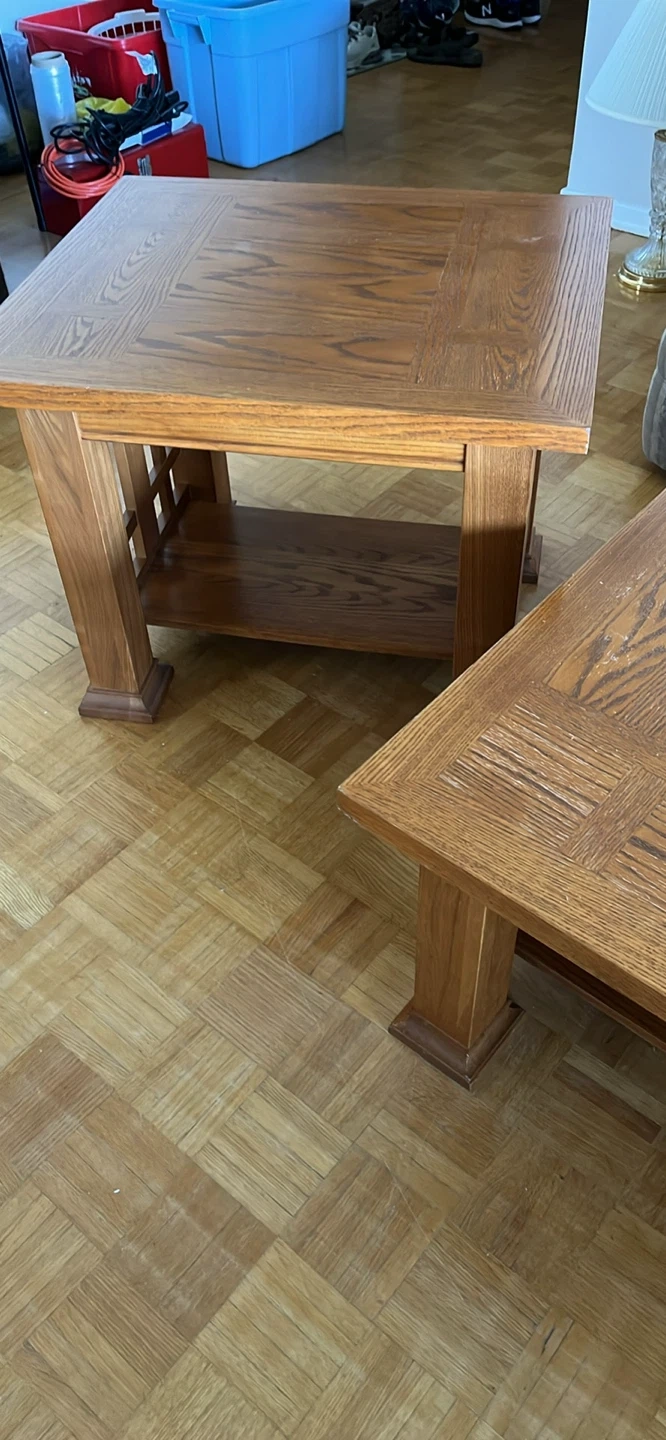 Selling a Matching Coffee Table and End Table Set. There are Two End Tables. They're made of Solid Wood and have a Classic Design. Both Coffee Table and End Tables have a Lower Shelf. Great for adding a warm touch to your living room, Recreation Room or Cottage. Dimensions: Coffee Table - 50”in Length , Width 30”in and Height 17” Side Tables - 28” x 24”, Height 22” Pet and Smoke Free Environment No Delivery