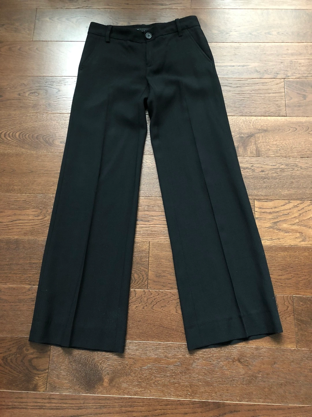 Size 0. Great condition, barely worn. Hemmed for someone 5’2 with heels. Really nice pockets in the back.