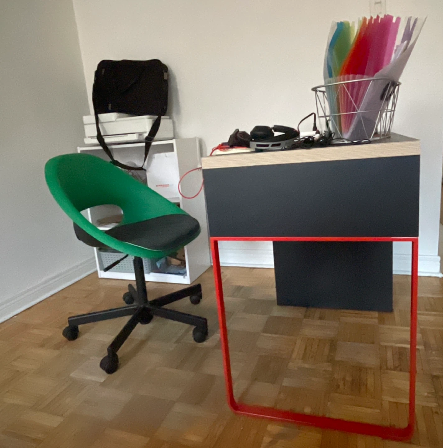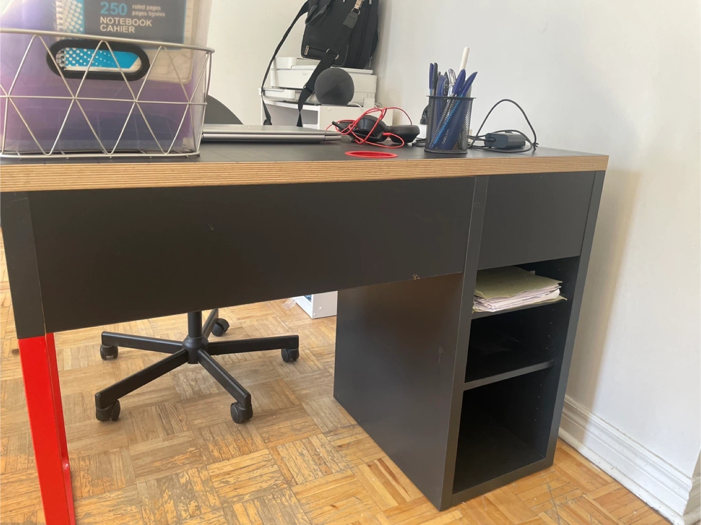 Selling an IKEA Micke office desk. The desk has a black top, red legs, and built-in storage. Great for a home office or student space.