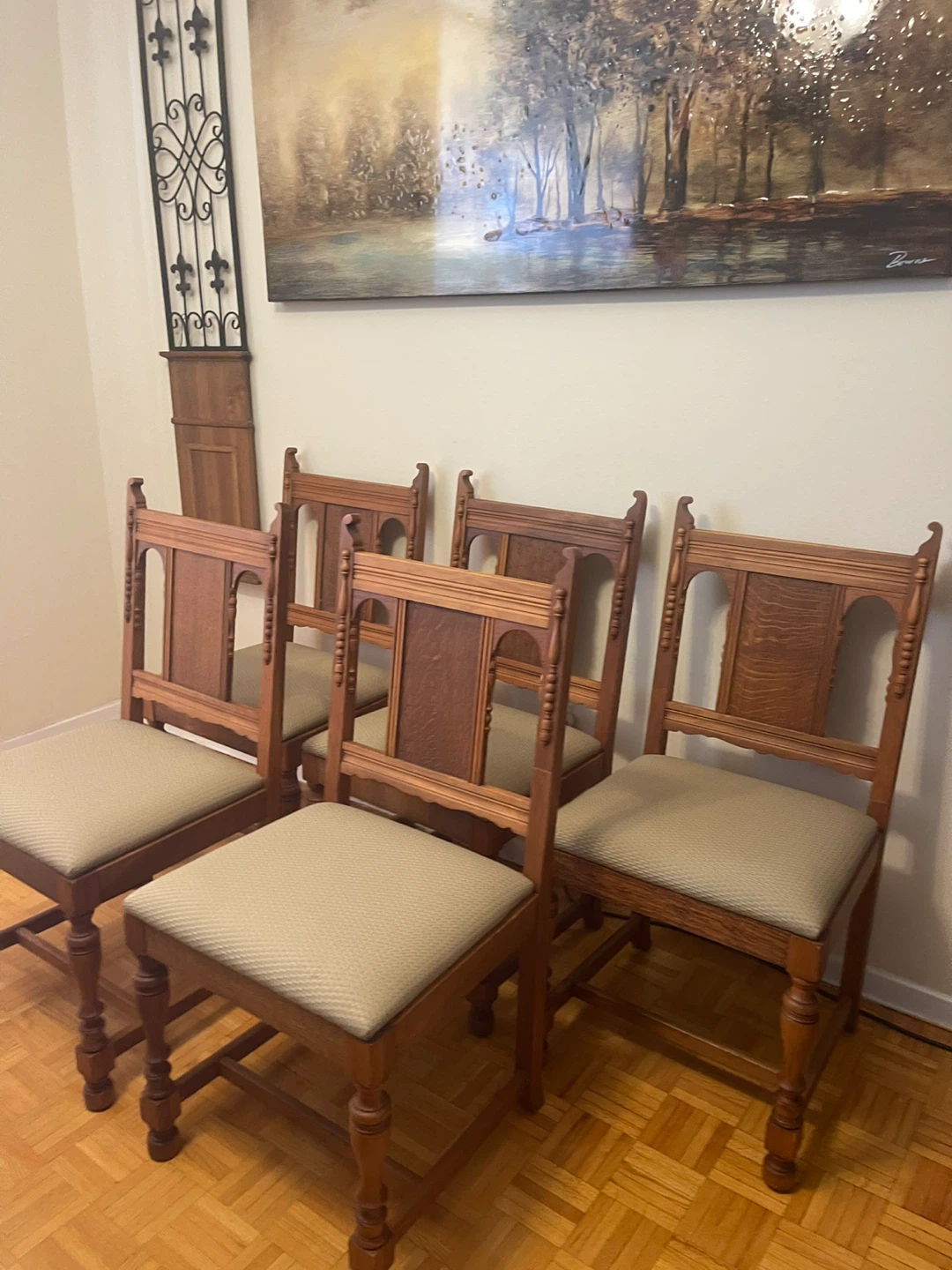 Selling a set of 5 vintage wooden dining chairs. They have a classic design with a wooden frame and neutral-coloured seat cushions. Perfect for adding a touch of vintage charm to your dining space!