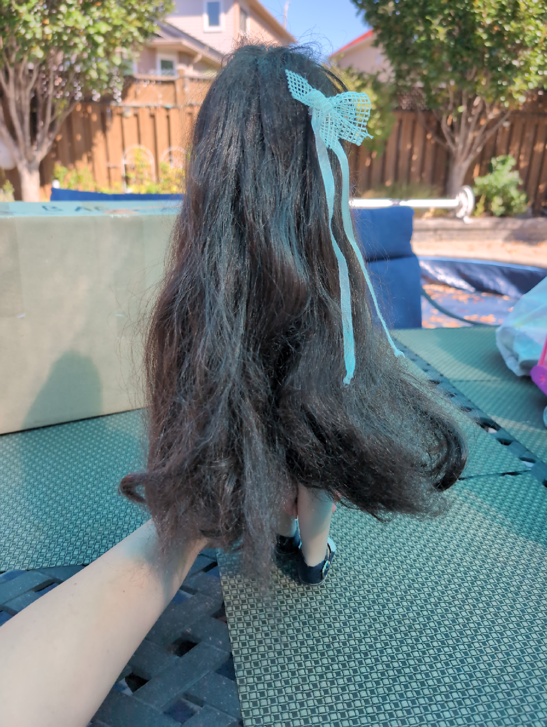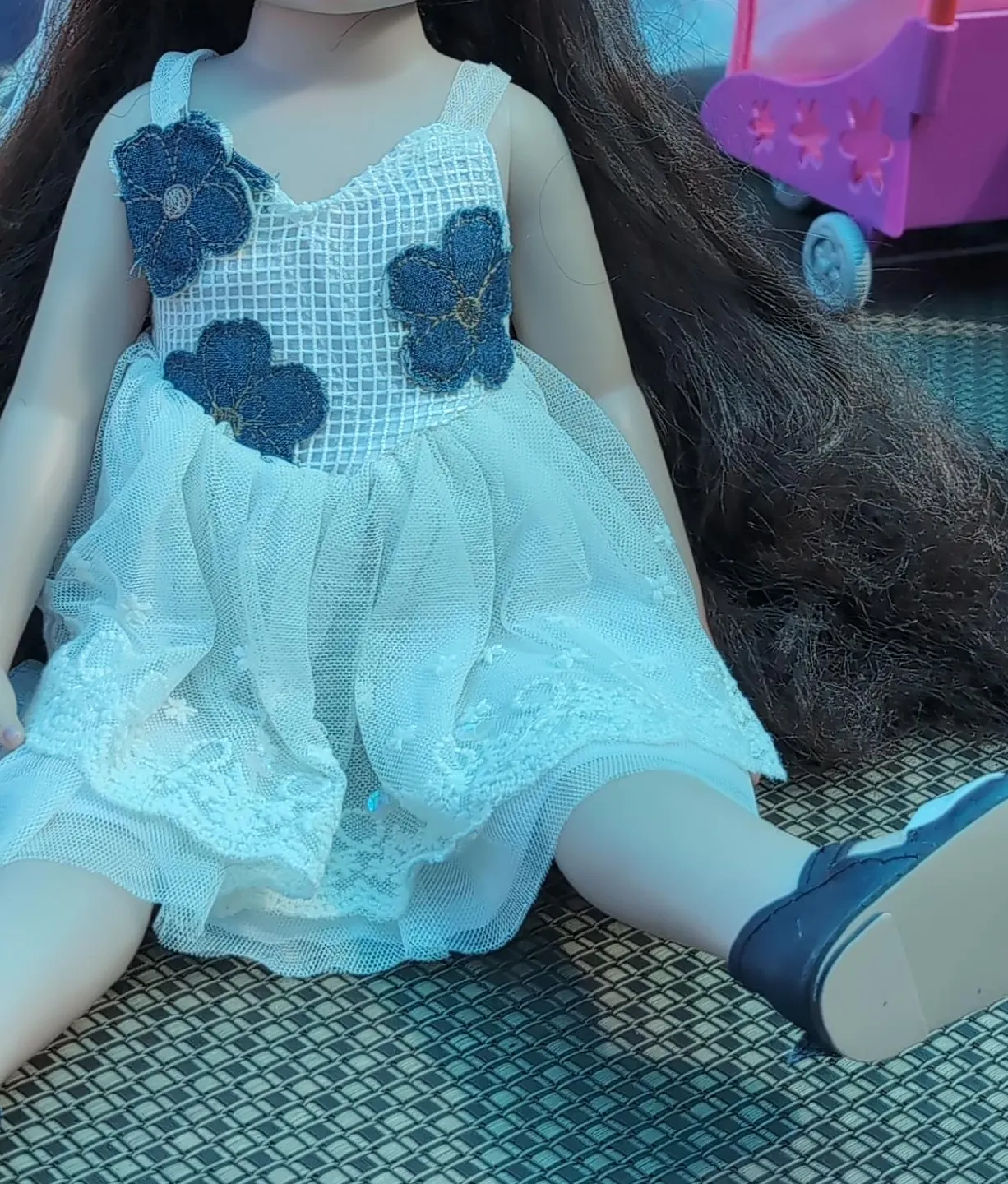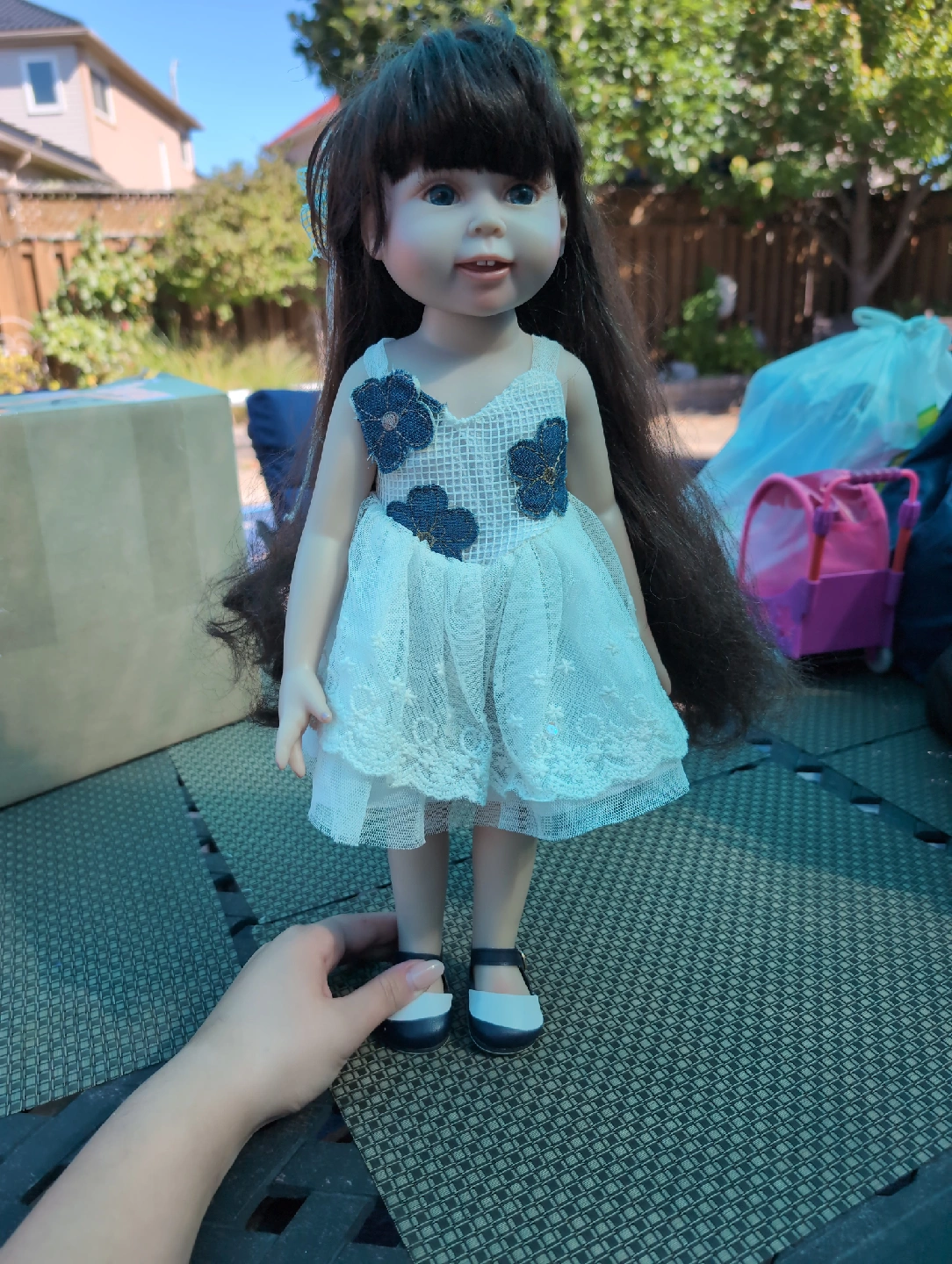 A doll with dark hair and a white dress is up for grabs! The dress features cute blue flower details. It's in good condition and ready for a new home!