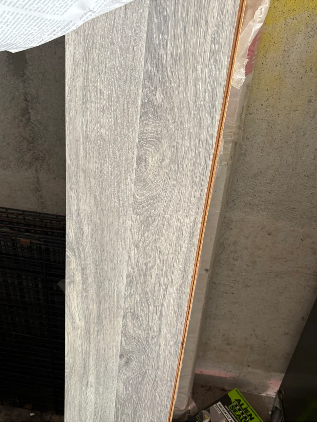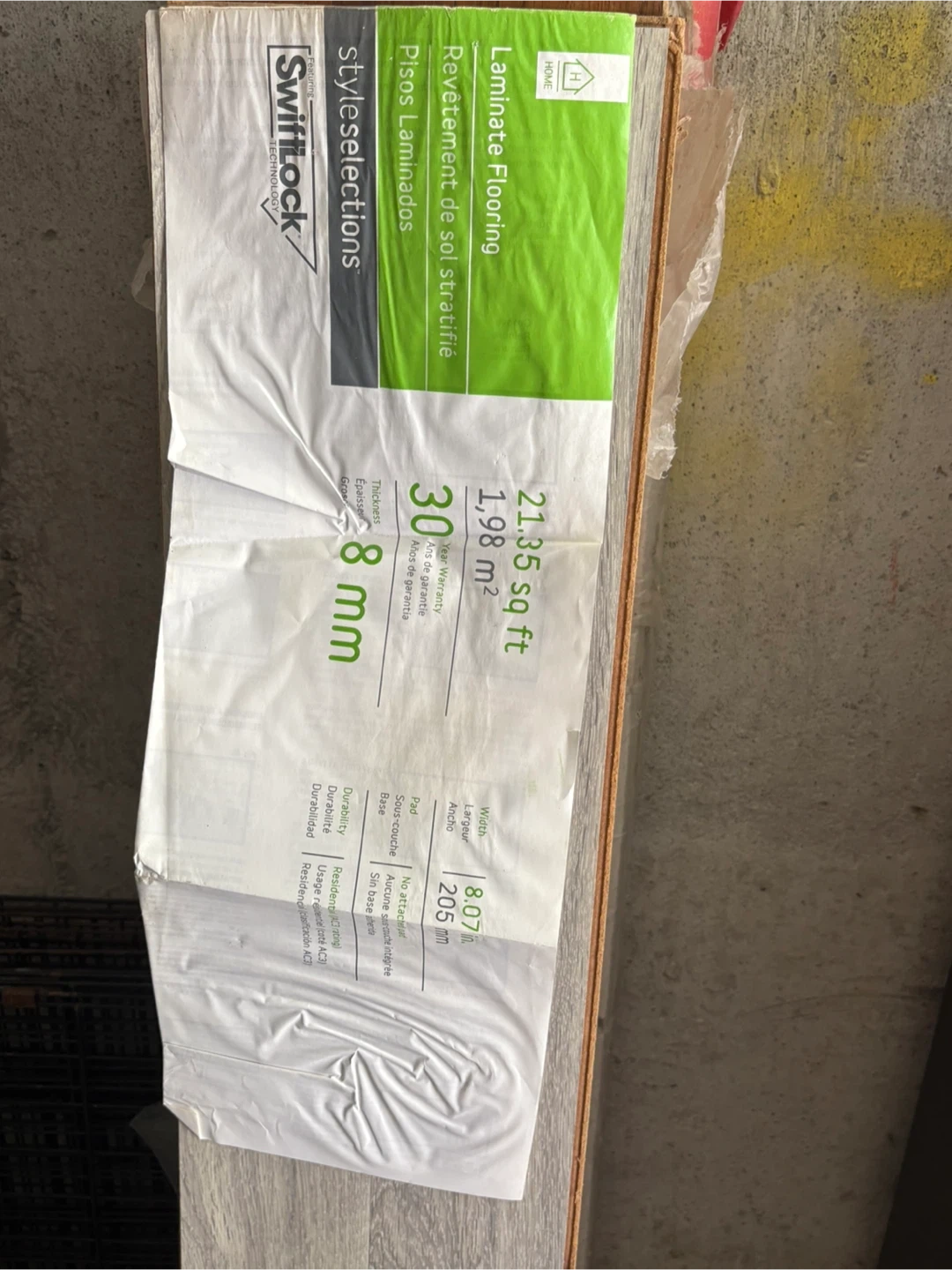 Selling some Style Selections laminate flooring! Each plank is about 8 mm thick and covers approximately 21.35 square feet. The width of each plank is around 8.07 inches or 205 mm. Great for a quick home upgrade!
