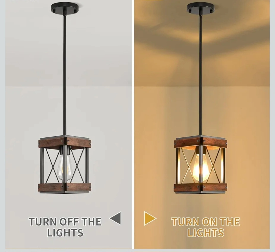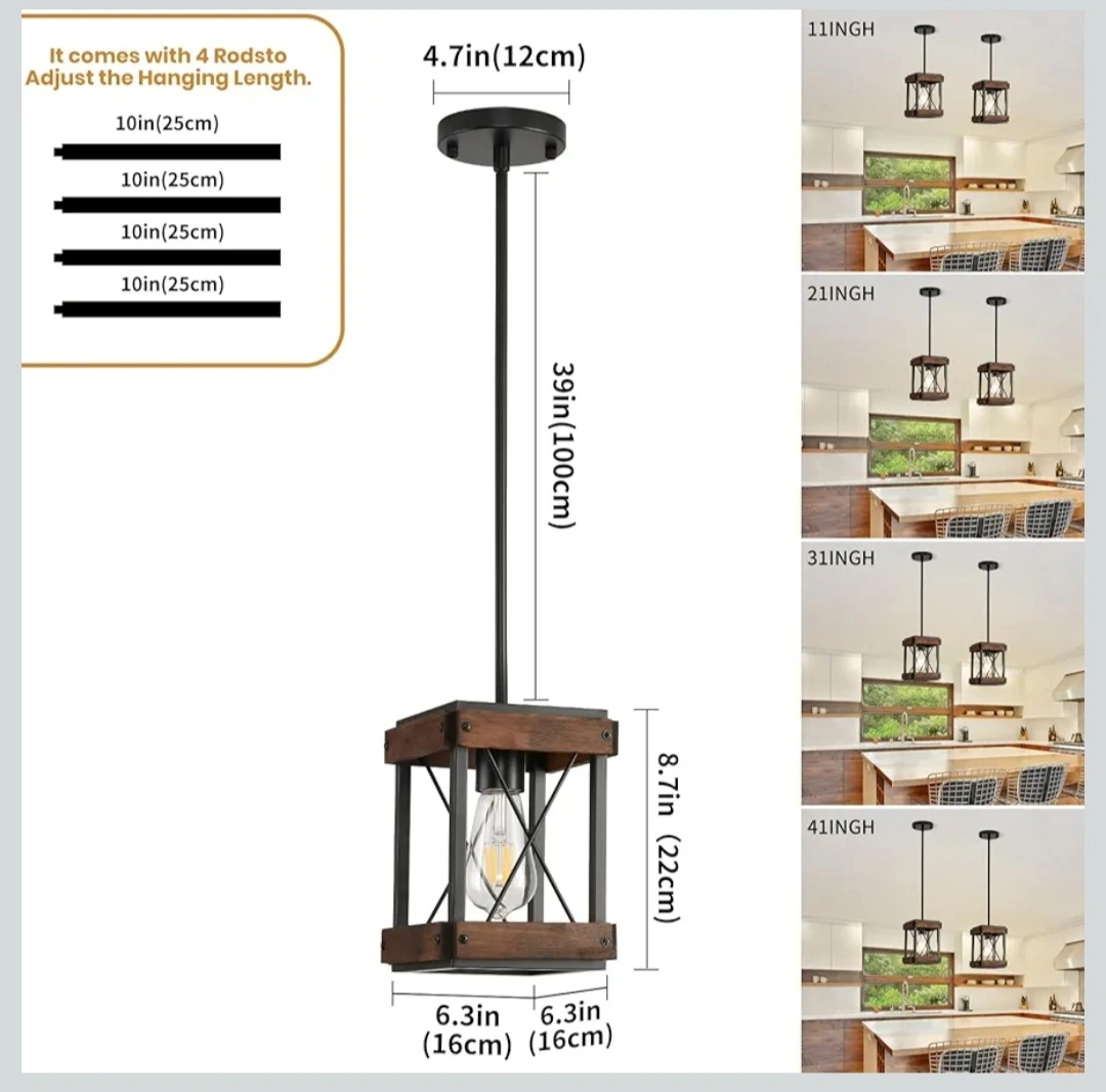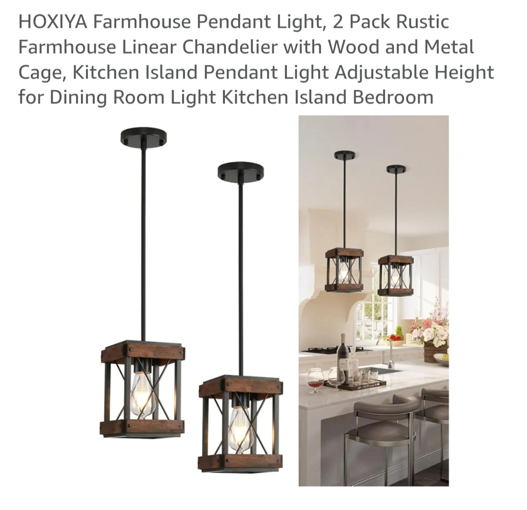 Selling a set of two HOXIYA Farmhouse Pendant Lights! These rustic linear chandeliers feature a wood and metal cage design, perfect for adding a touch of farmhouse charm to your kitchen island, dining room, or bedroom. Key features: - Adjustable height with included rods - Suitable for flat, sloped, and vaulted ceilings - E26 base type bulbs - Dimensions: 6.3in x 6.3in (16cm x 16cm) for the cage, 39in (100cm) total height