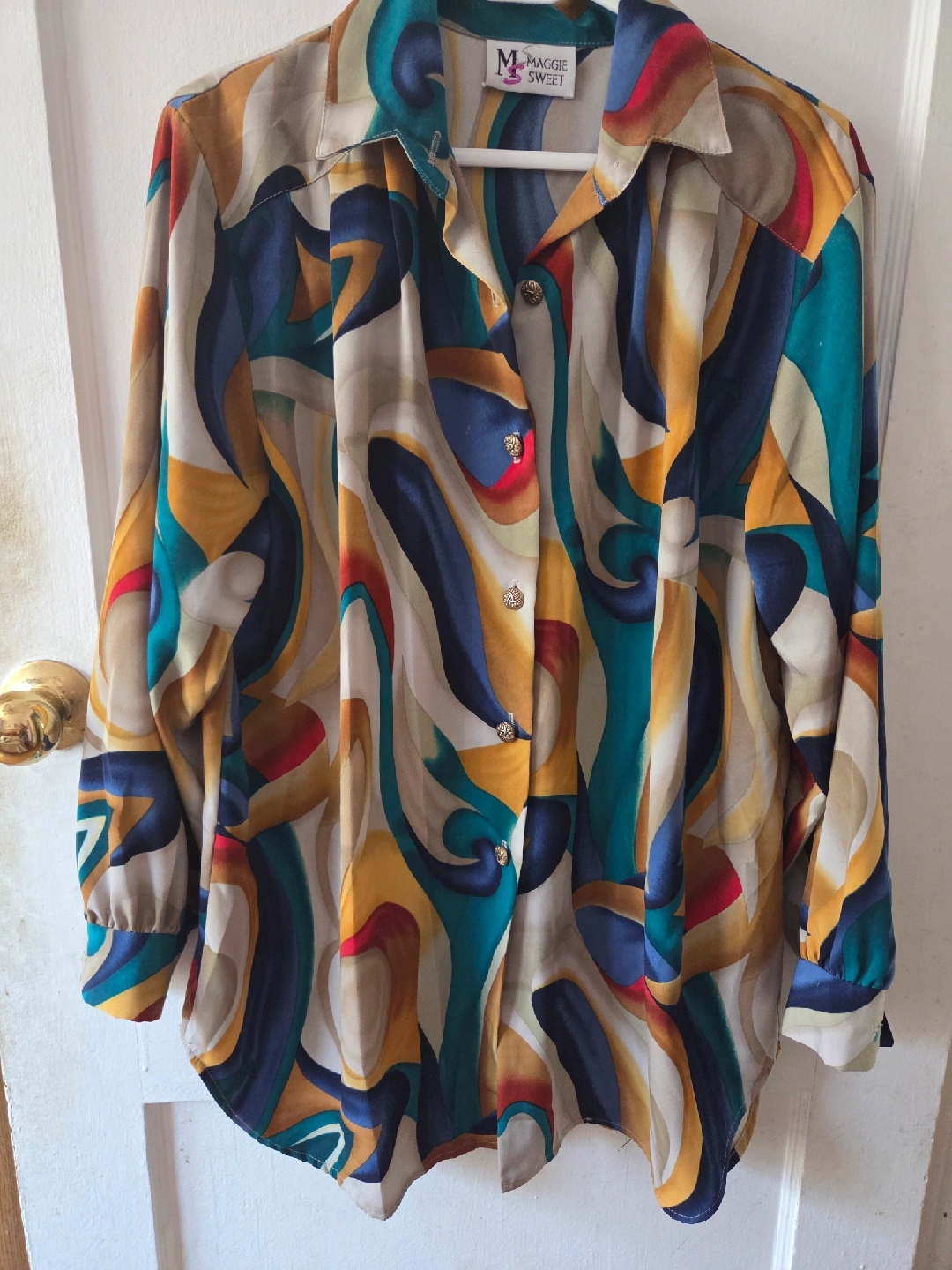 A fun and vibrant Maggie Sweet blouse! This long-sleeved button-up shirt features a unique multicolor pattern that's sure to make a statement. Perfect for adding a pop of colour to your wardrobe!