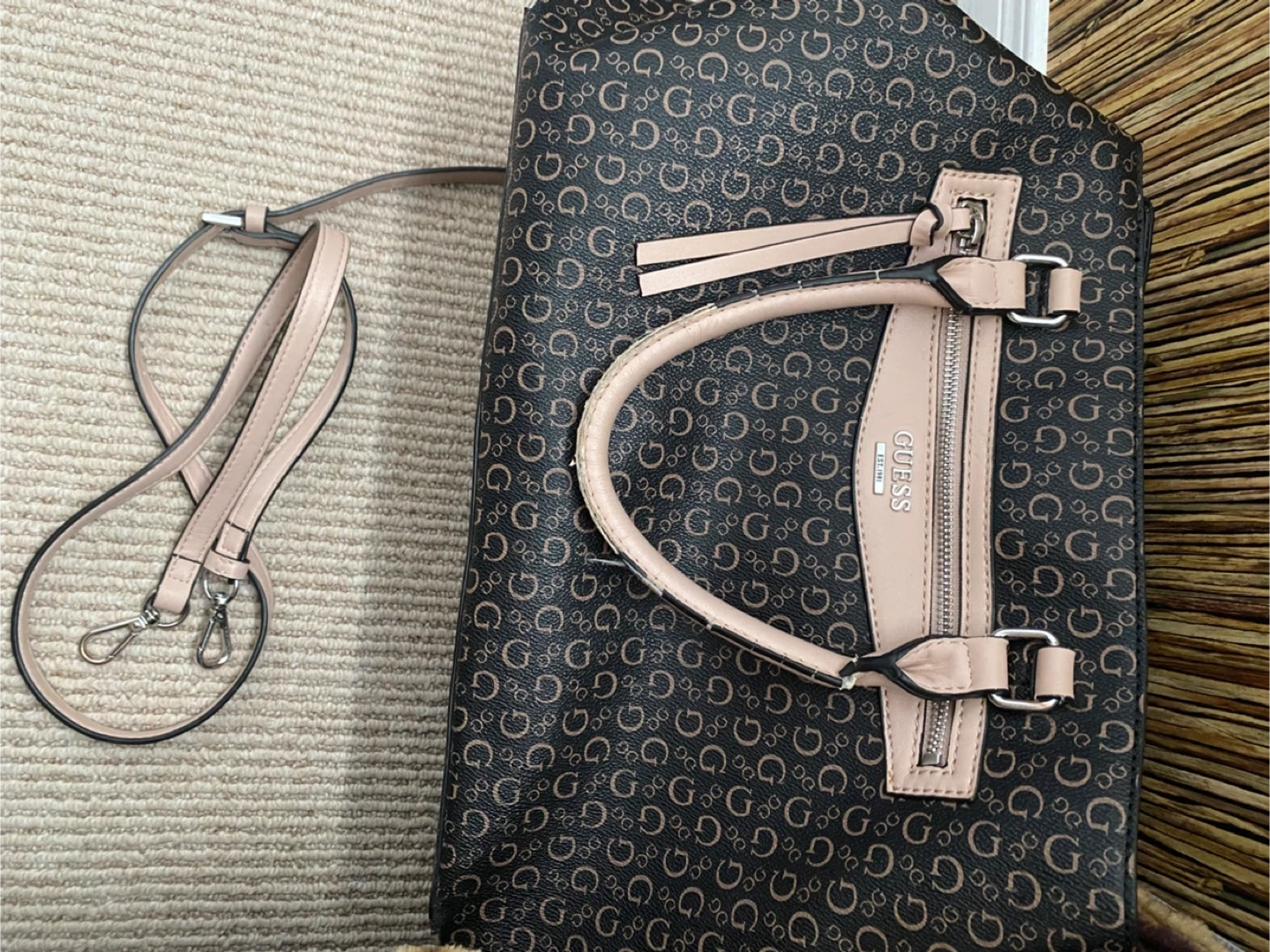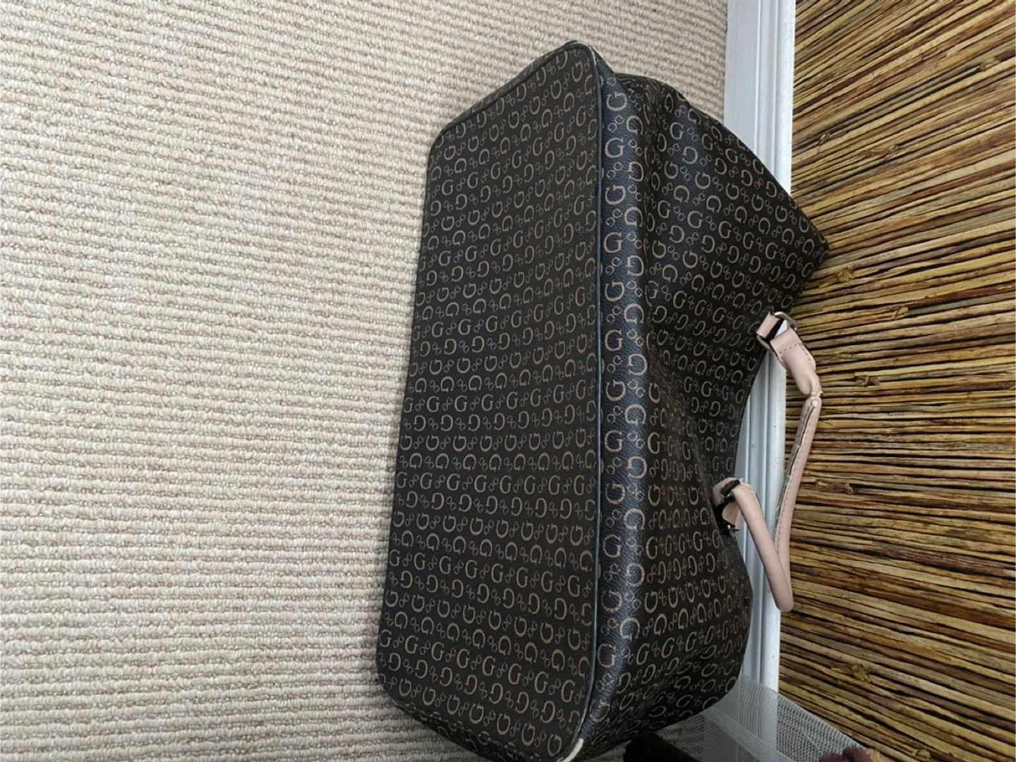 This is a Guess tote bag with a brown and beige design. It has a shoulder strap and a handle. The inside lining is also Guess-branded. It's in good condition and ready for a new home!