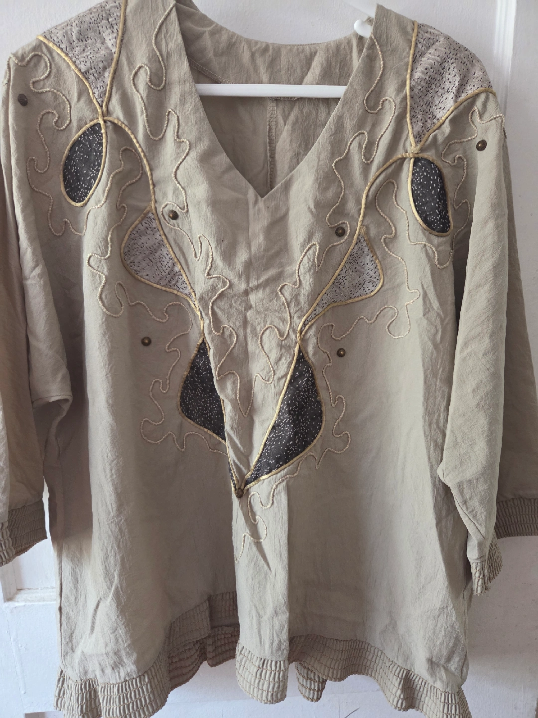 98A beige blouse with intricate embroidery detailing. It has a V-neck and three-quarter sleeves. The material looks like a lightweight linen or cotton blend, perfect for warmer weather!