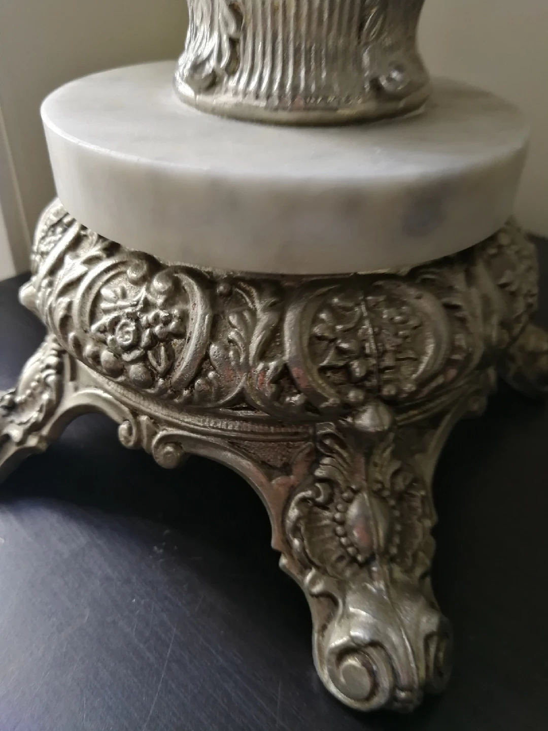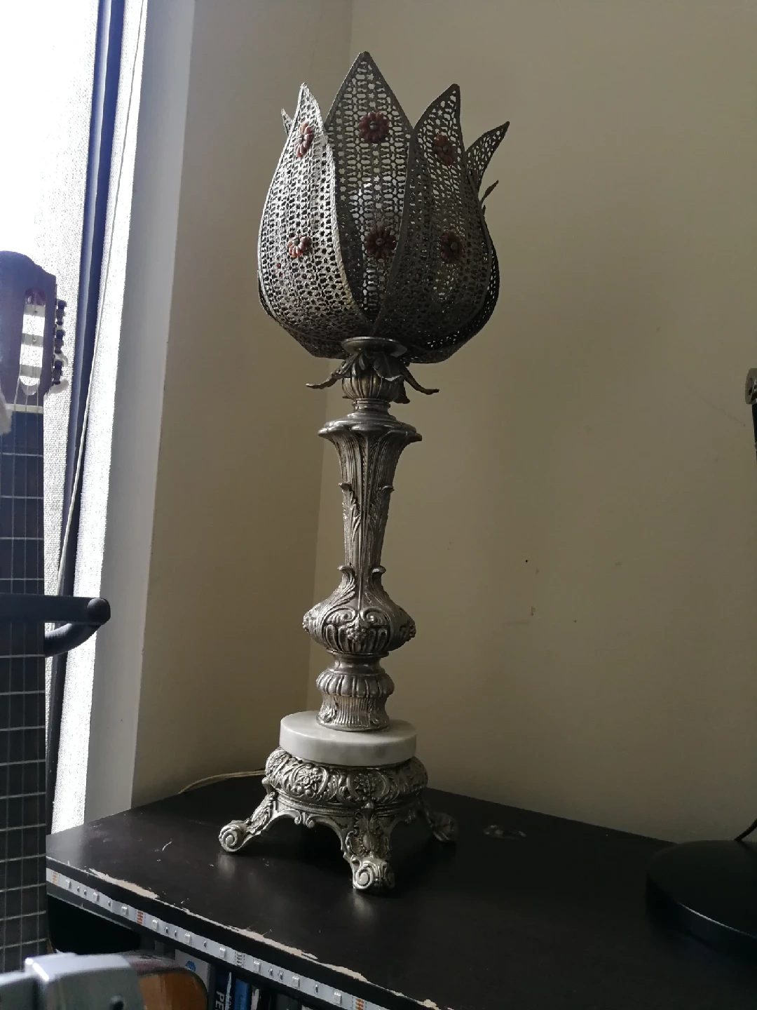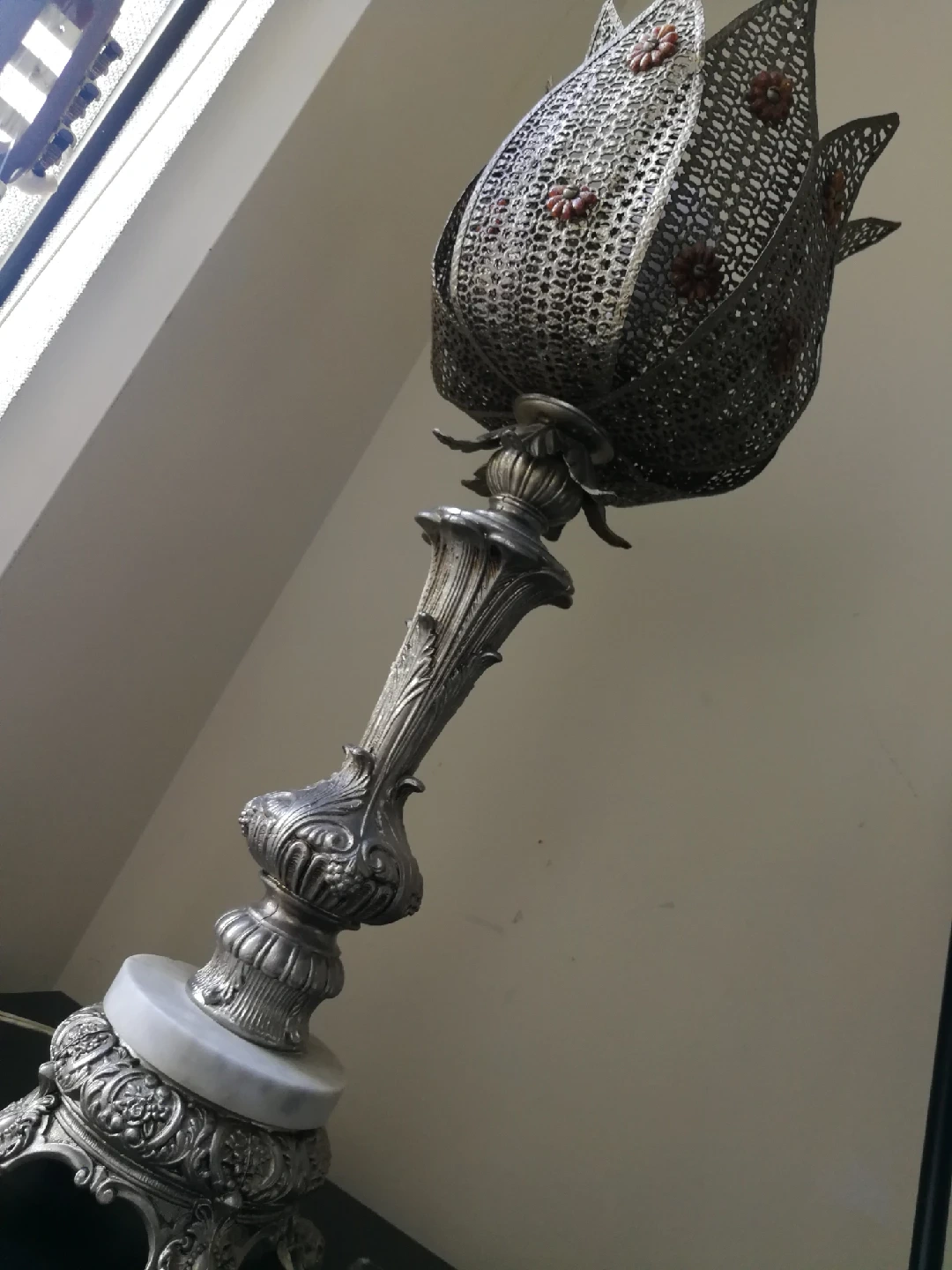 97Selling a unique vintage table lamp! It features a beautiful silver tulip design with intricate details. The base has a marble accent and ornate carvings. A lovely piece to add character to any room!