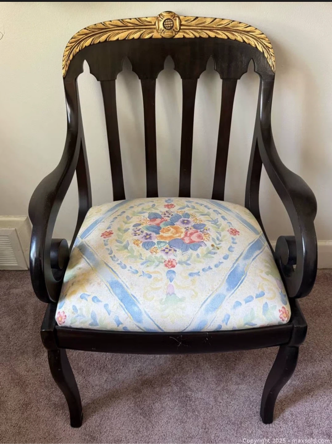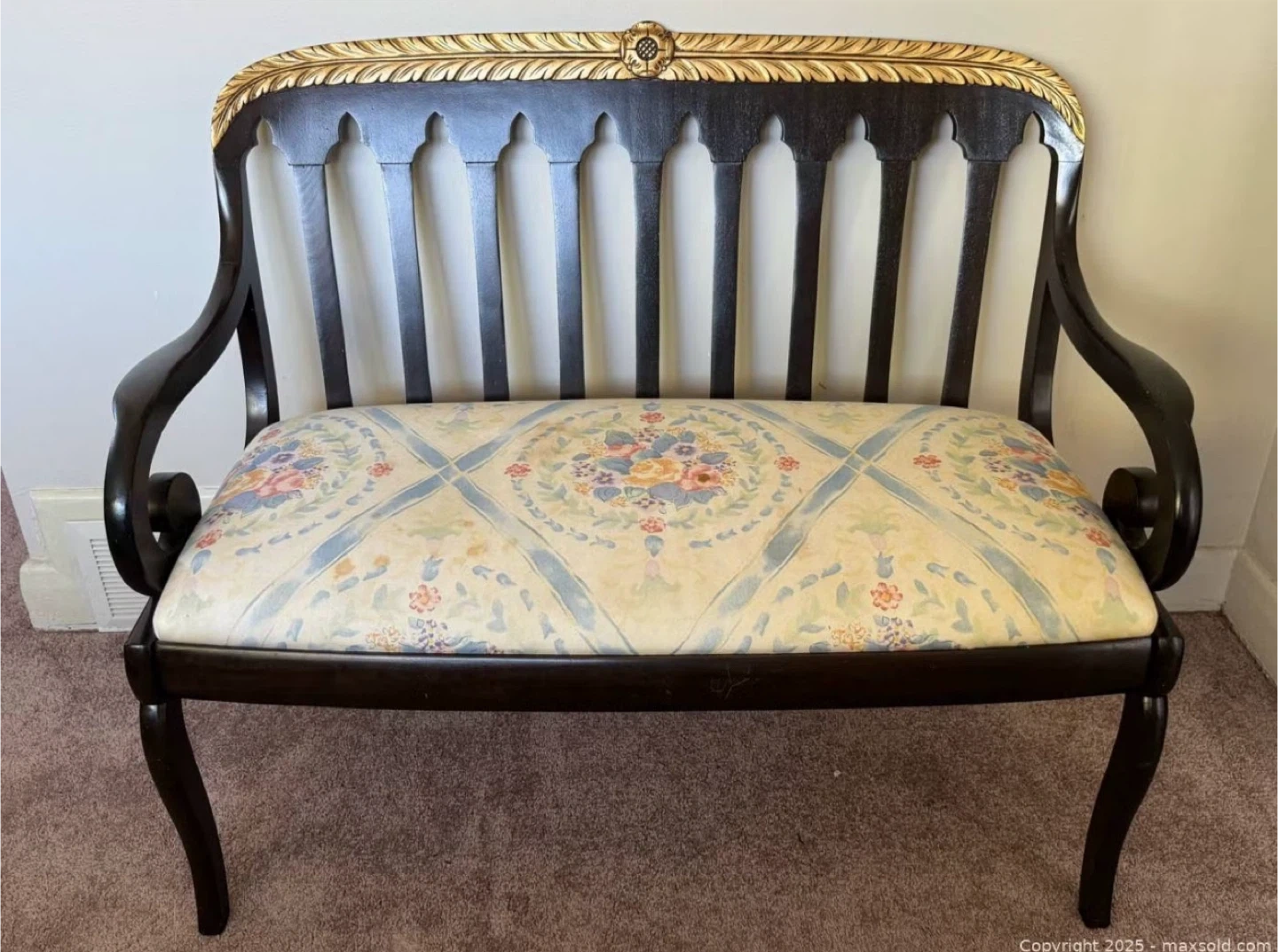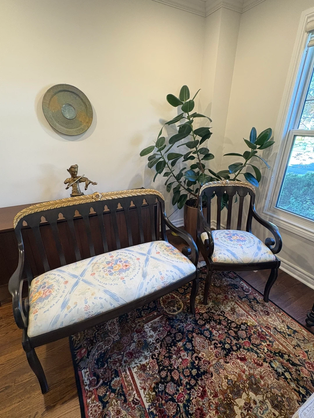 Selling a beautiful antique loveseat and chair set! The dark wood frame is accented with a gold trim detail, and the cushions feature a lovely floral pattern. These pieces would add a touch of vintage charm to any room!
