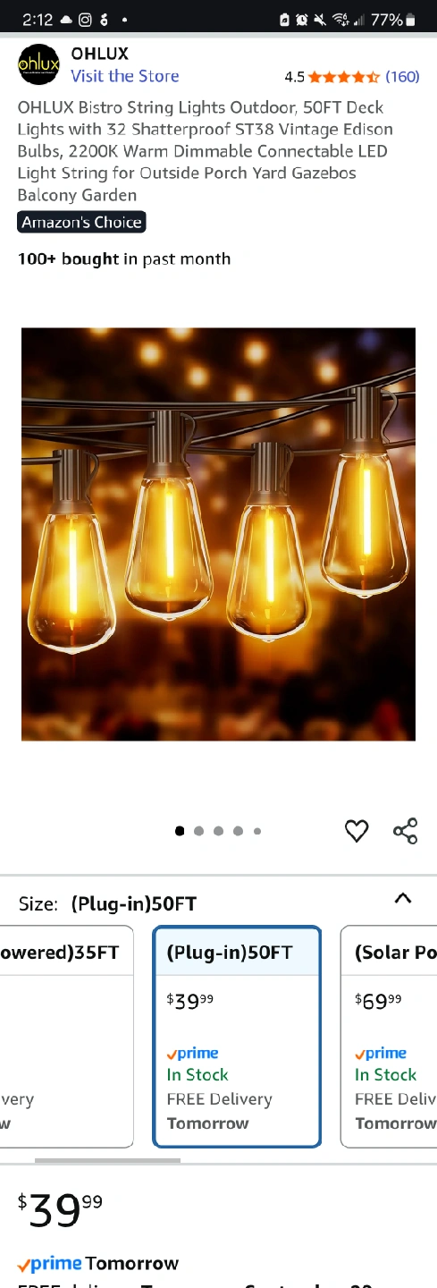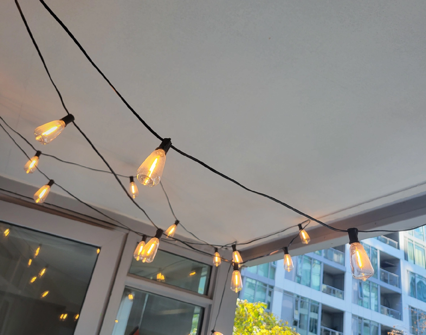Pickup ASAP - By Sept 30th! Outdoor String Lights, perfect for adding a warm glow to your outdoor space! These are the 50FT plug-in version. They feature 32 shatterproof ST38 vintage Edison bulbs with a 2200K warm dimmable light.