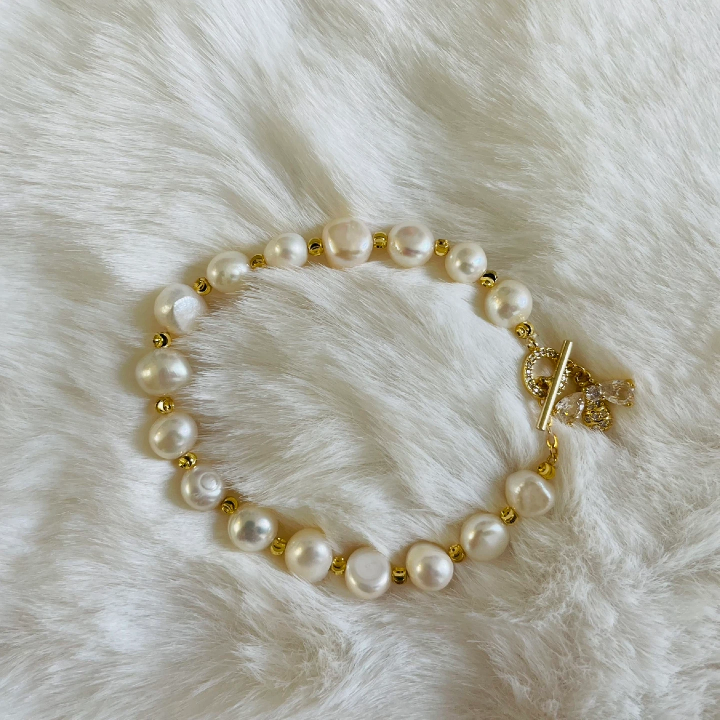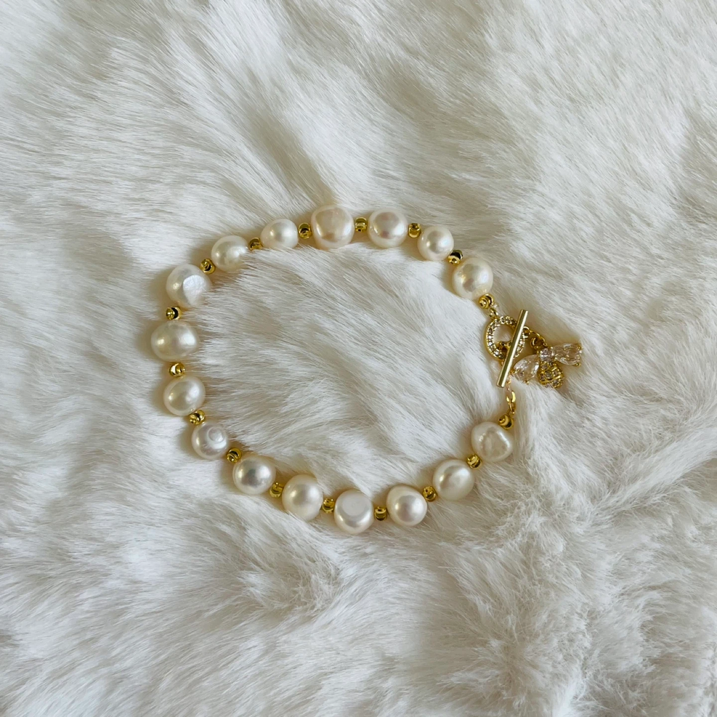 This is a beautiful real pearl bracelet with gold accents. It features a unique toggle clasp with a small bee detail. The bracelet is brand new and would be a lovely addition to any jewelry collection Pickup locations are in Richmond Hill, Markham or DT Toronto. Delivery is also available