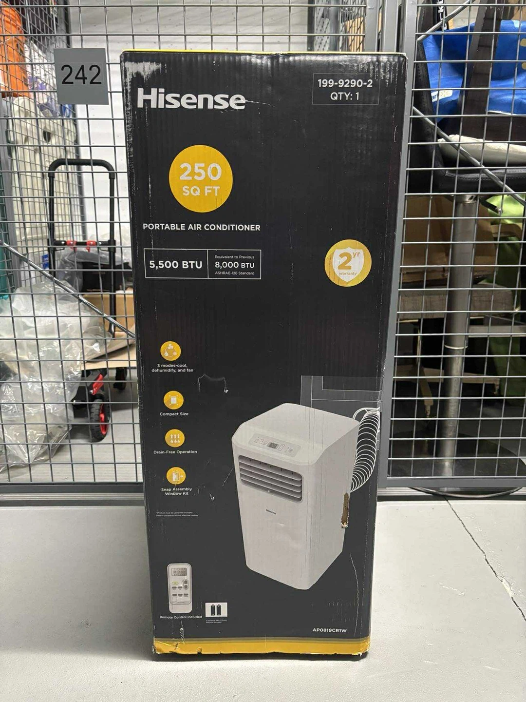 Selling a Hisense portable air conditioner, perfect for spaces up to 250 sq ft! It features 3 modes: cool, dehumidify, and fan. It's a compact size with drain-free operation and includes a snap assembly window kit and remote control.