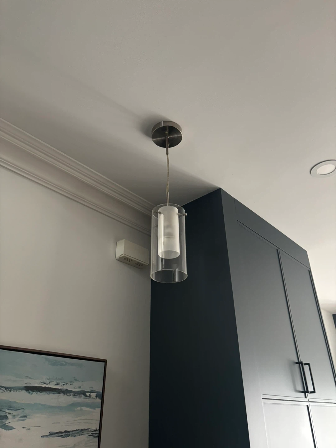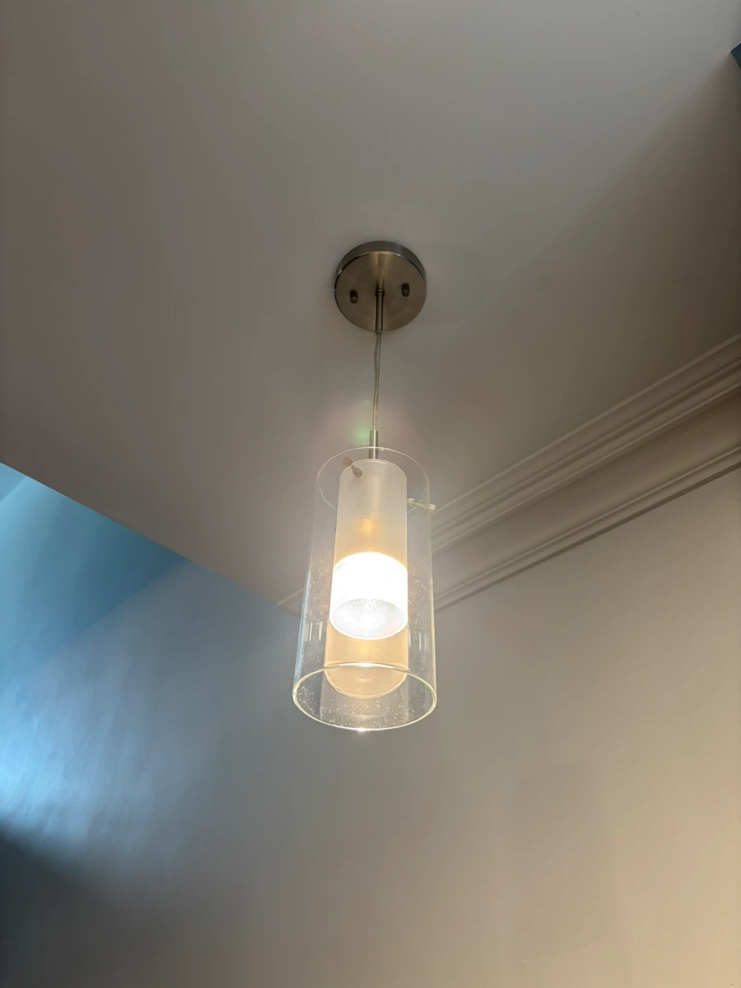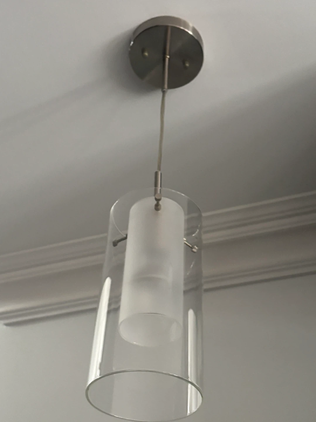 78Selling a pendant ceiling light fixture. It features a clear glass outer shade and a frosted inner shade. Perfect for adding a touch of modern elegance to any room!