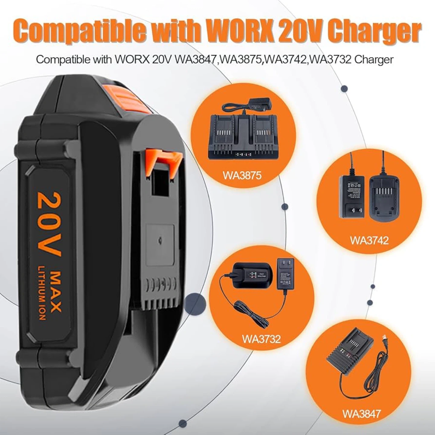 Selling two brand new replacement WORX 20V Max Lithium Ion battery. It has a capacity of 3500mAh. It's compatible with WORX 20V chargers like WA3847, WA3875, WA3742, and WA3732. It has multiple protection features including over-charge, over-temperature, over-current, over-discharge, over-voltage, and short circuit protection