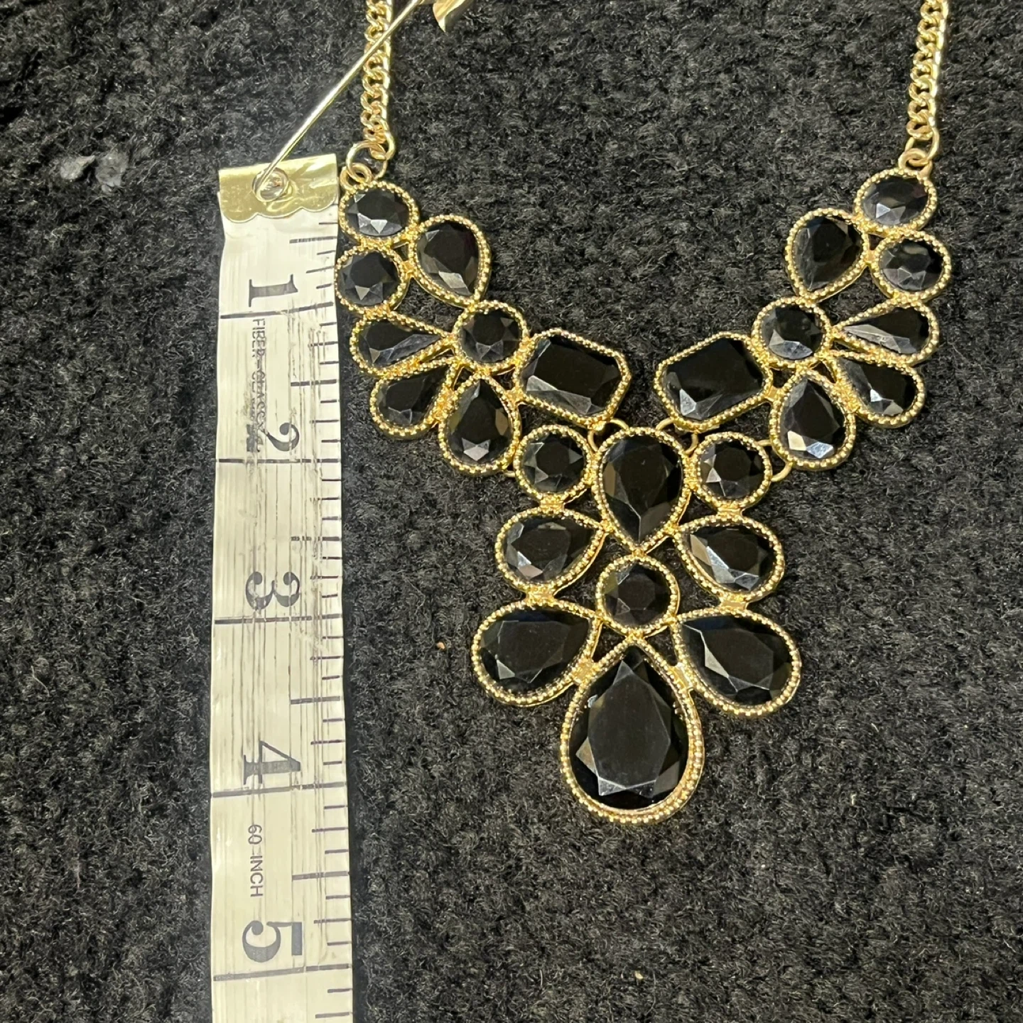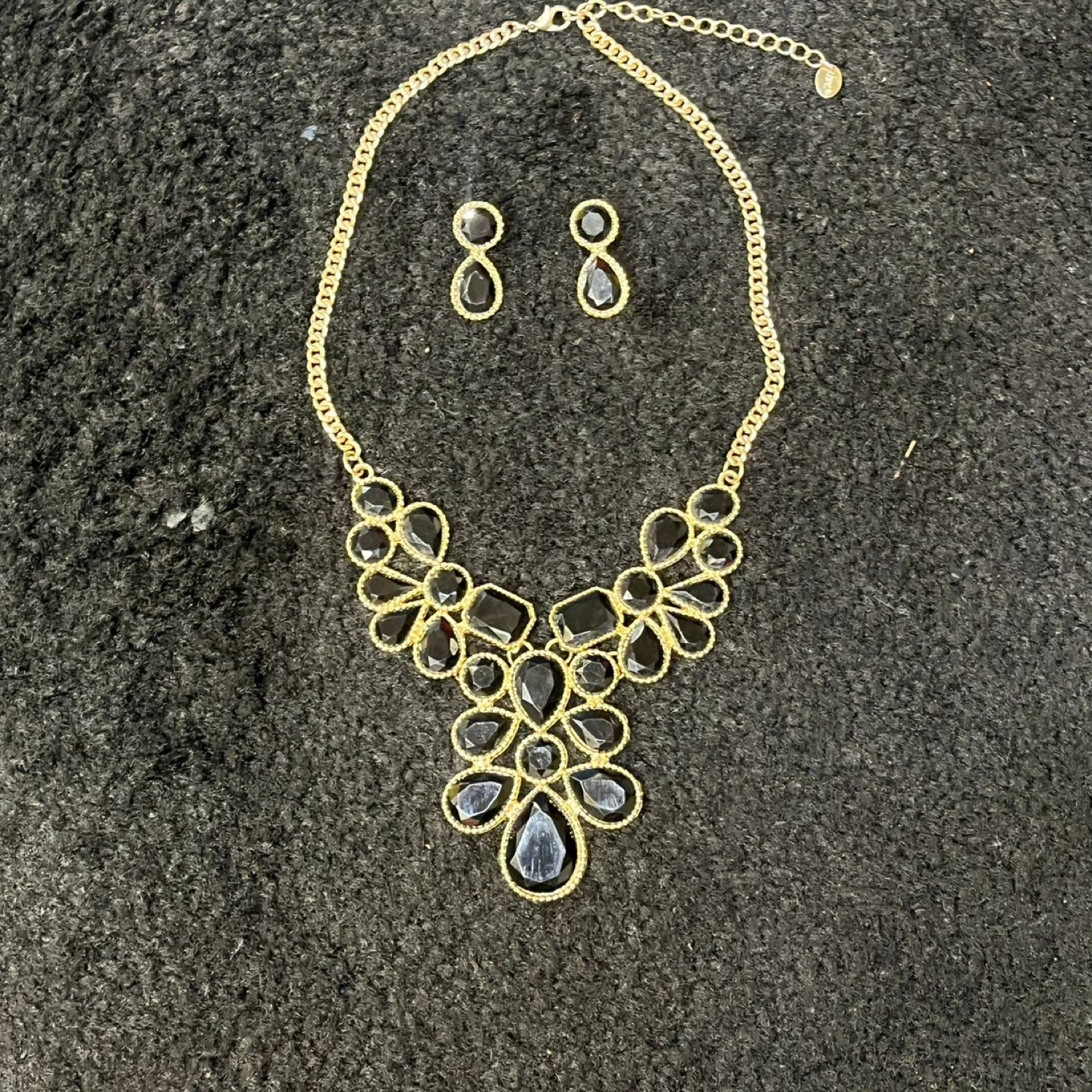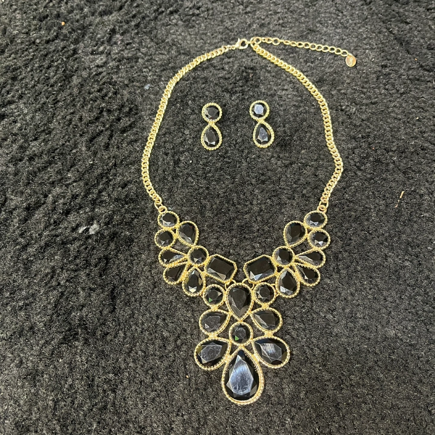 Selling a beautiful gold-tone necklace and earrings set! The necklace features a lovely arrangement of black stones, and it comes with matching earrings. Perfect for adding a touch of elegance to any outfit