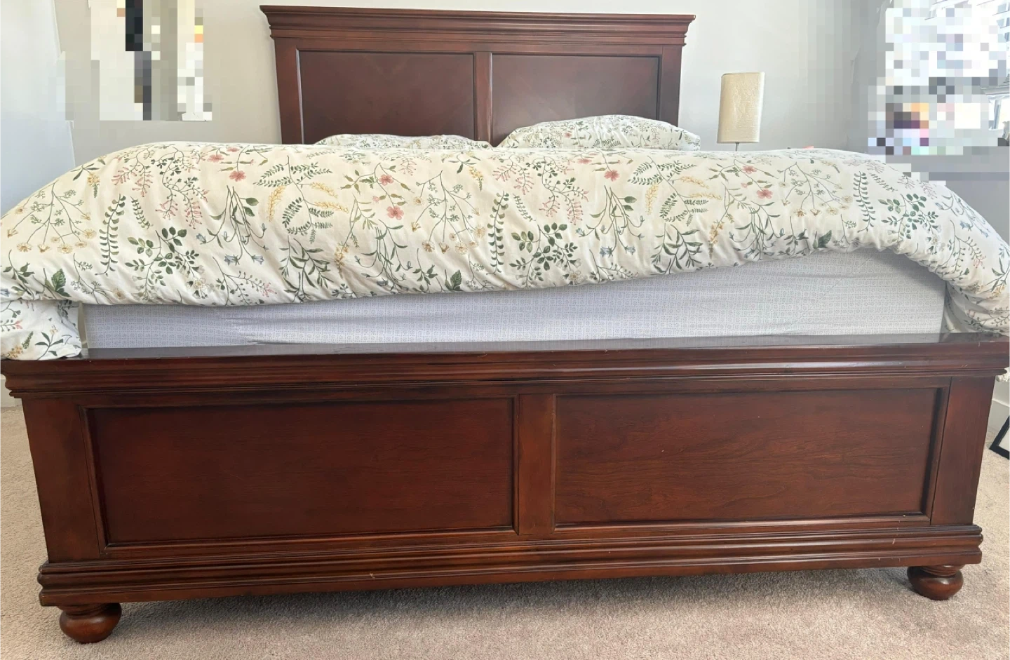 Selling a queen size bed frame. It's a dark wood finish and in good condition. Selling the bed with its 2 mattresses. Price can be negotiated. Selling reason: I’m moving out of the country