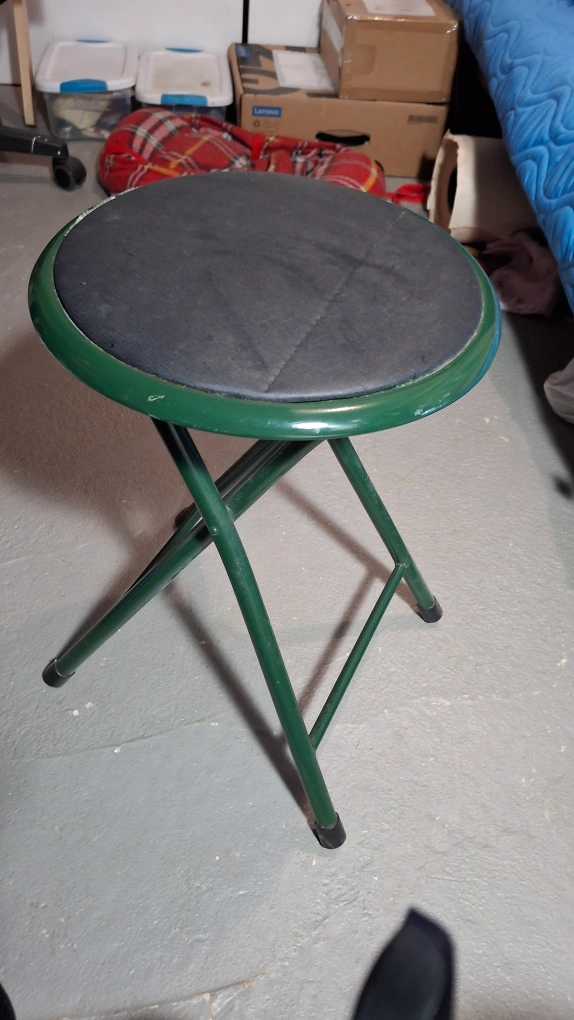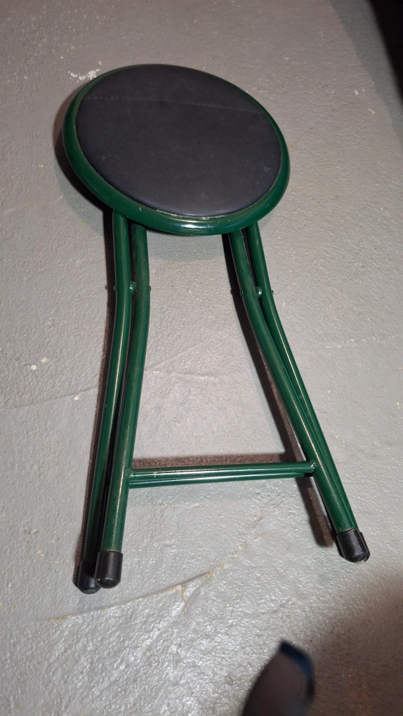 Selling a handy green folding stool! It's great for when you need an extra seat that can be easily stored away. It's in good condition and ready for a new home seat diameter 12" from floor to top of seat 17" 2 available