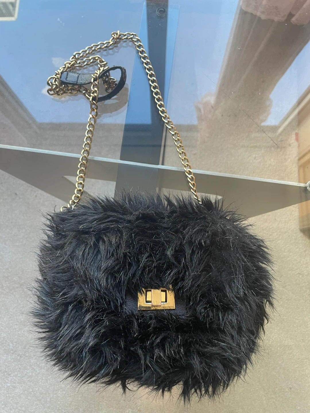 Please note the wear on the handle. Selling a cute fuzzy black purse with a gold chain strap! It's a unique and stylish accessory to add to your collection. The purse is in good condition and ready for a new home